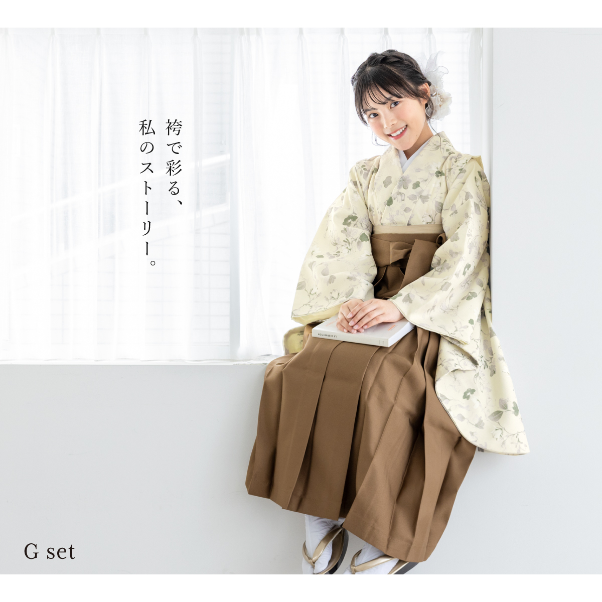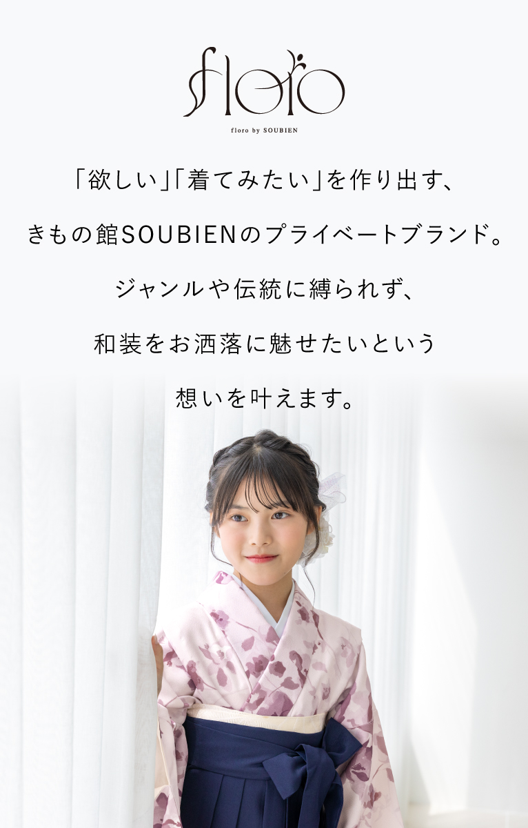 きもの館SOUBIENのプライベートブランド『floro by SOUBIEN』(フローロ)の二尺袖着物を合わせた華やかな袴セットです。『floro by SOUBIEN』(フローロ)は、移りゆく和装トレンドの最先端を常に追い求め、「欲しい」「着てみたい」を作り出す、きもの館SOUBIENのプライベートブランドです。ジャンルや系統に縛られず、あらゆるシーンに求められる和装スタイルを展開し、今流行りの人気を押さえ、和装のお洒落を魅せたいという想いをコンセプトに真心を込めて作りました。