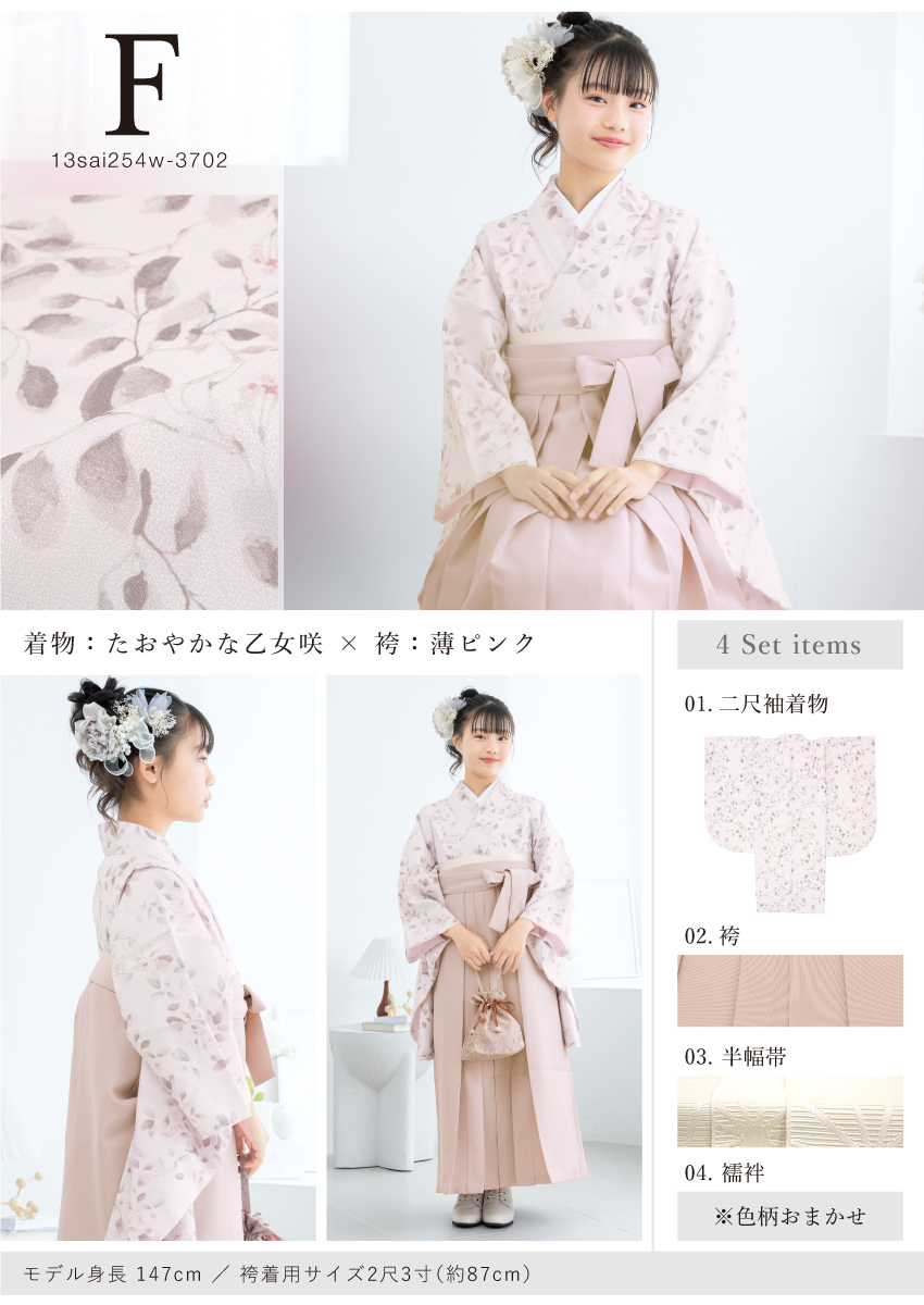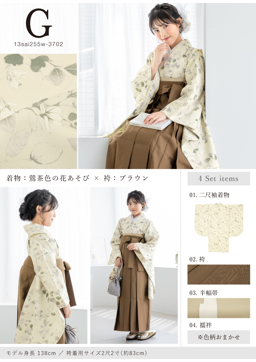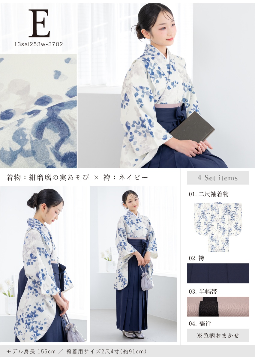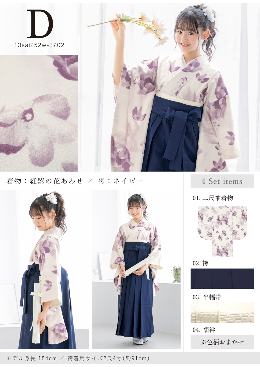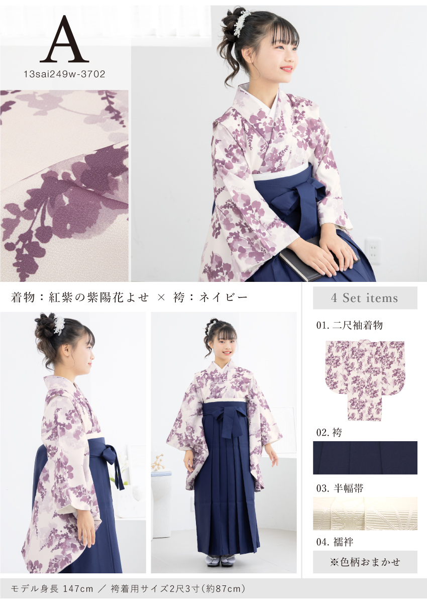 13歳ハイジュニア向けの二尺袖着物と袴の4点セット