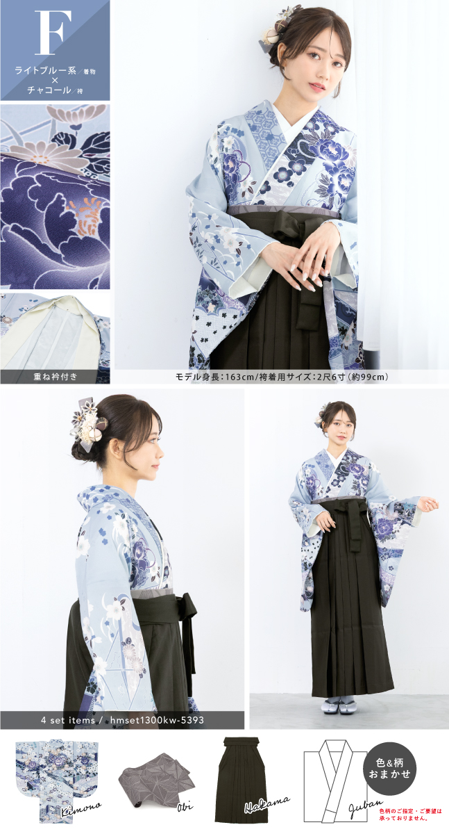 着物(重ね衿付き)、袴、襦袢(半衿付き)、下帯