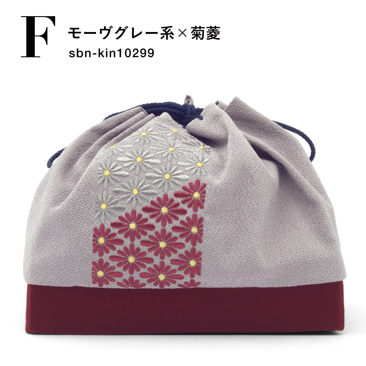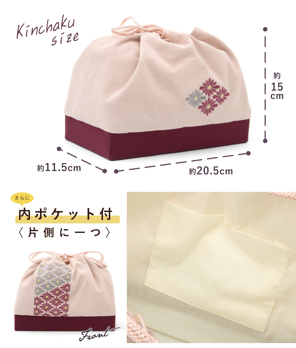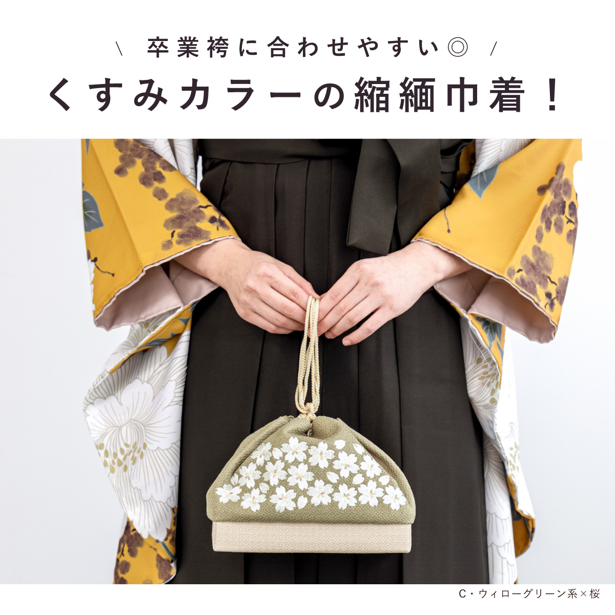 トレンドのくすみカラーと刺繍が大人かわいい女性向け巾着です。縮緬(ちりめん)の生地に桜の花々や菊菱が刺繍された、はんなりとしたデザインです。生地の素材は、絹のような手触りの上質なポリエステルです。カジュアル着物だけではなく、卒業式の袴など古典的な柄の華やかな装いにもオススメです。