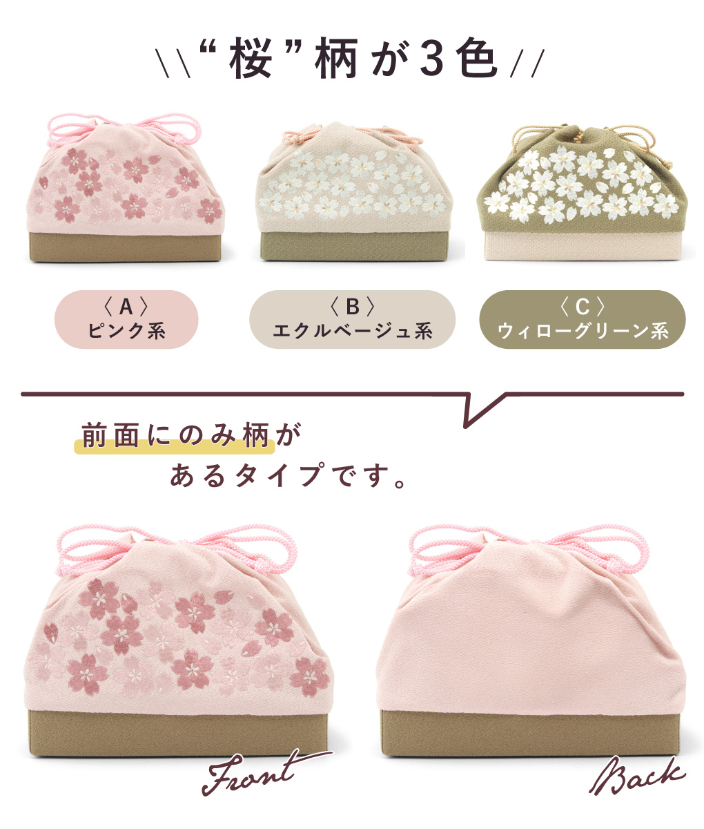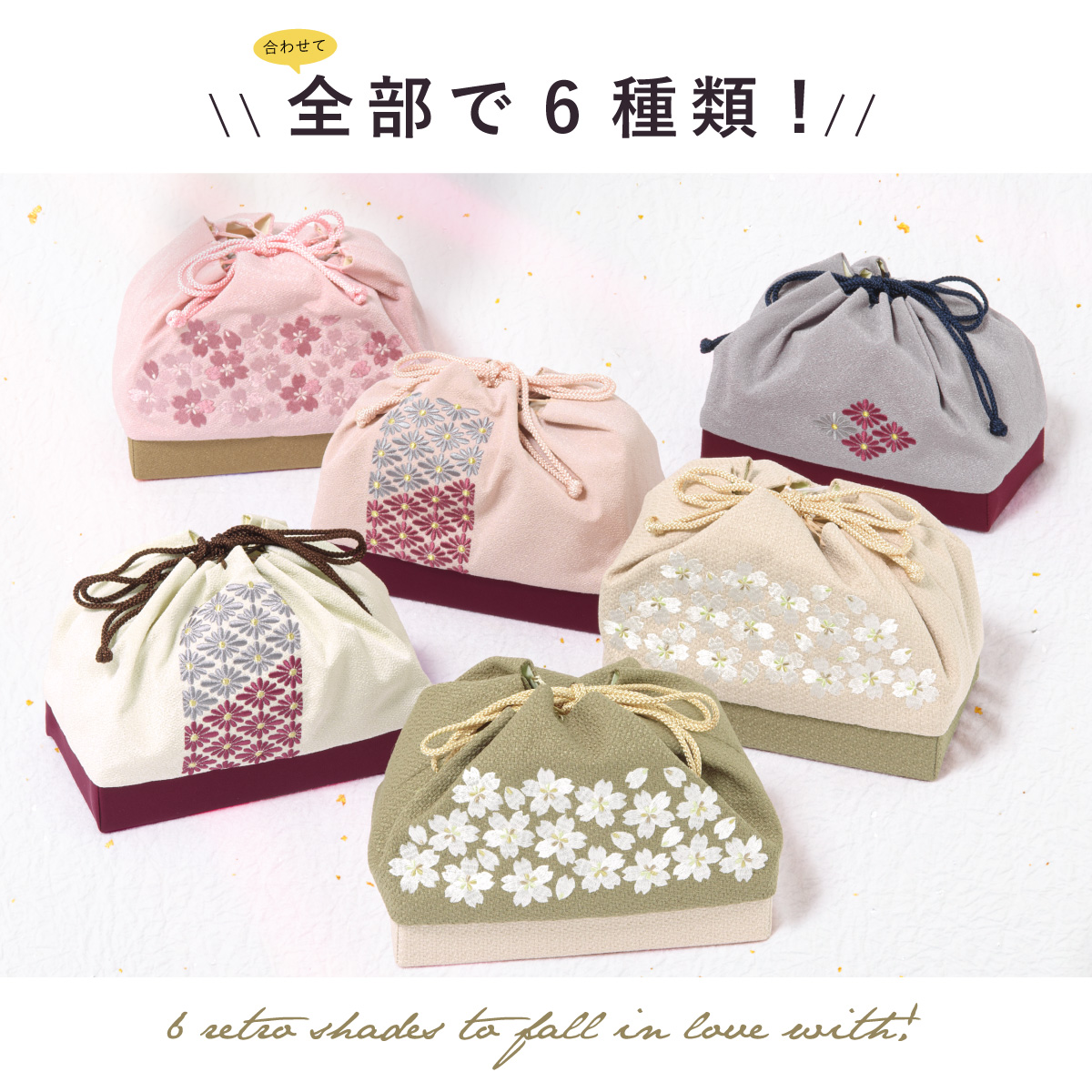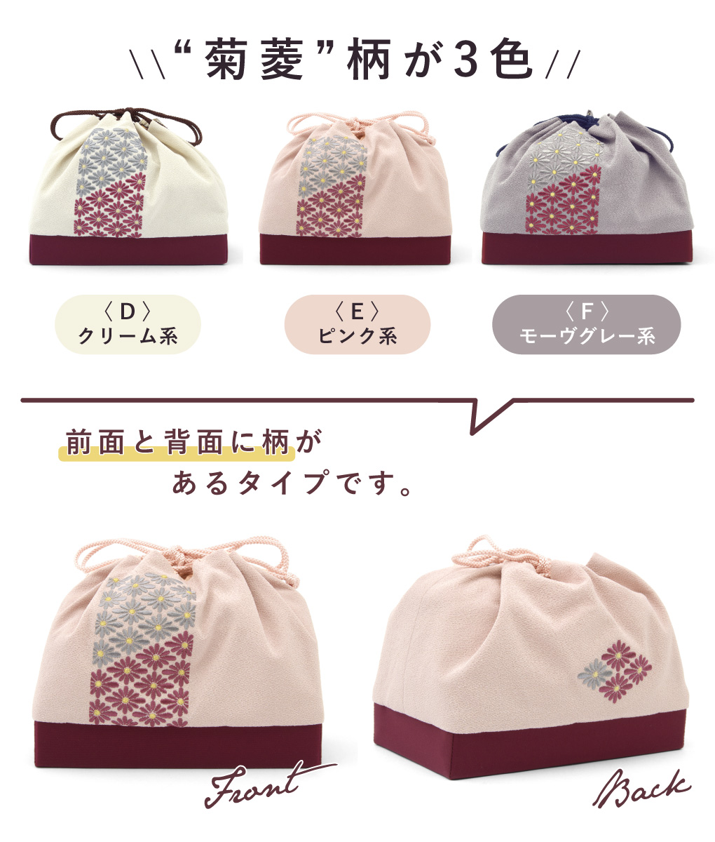 トレンドのくすみカラーと刺繍が大人かわいい女性向け巾着です。縮緬(ちりめん)の生地に桜の花々や菊菱が刺繍された、はんなりとしたデザインです。生地の素材は、絹のような手触りの上質なポリエステルです。カジュアル着物だけではなく、卒業式の袴など古典的な柄の華やかな装いにもオススメです。