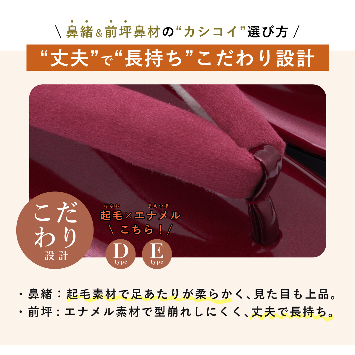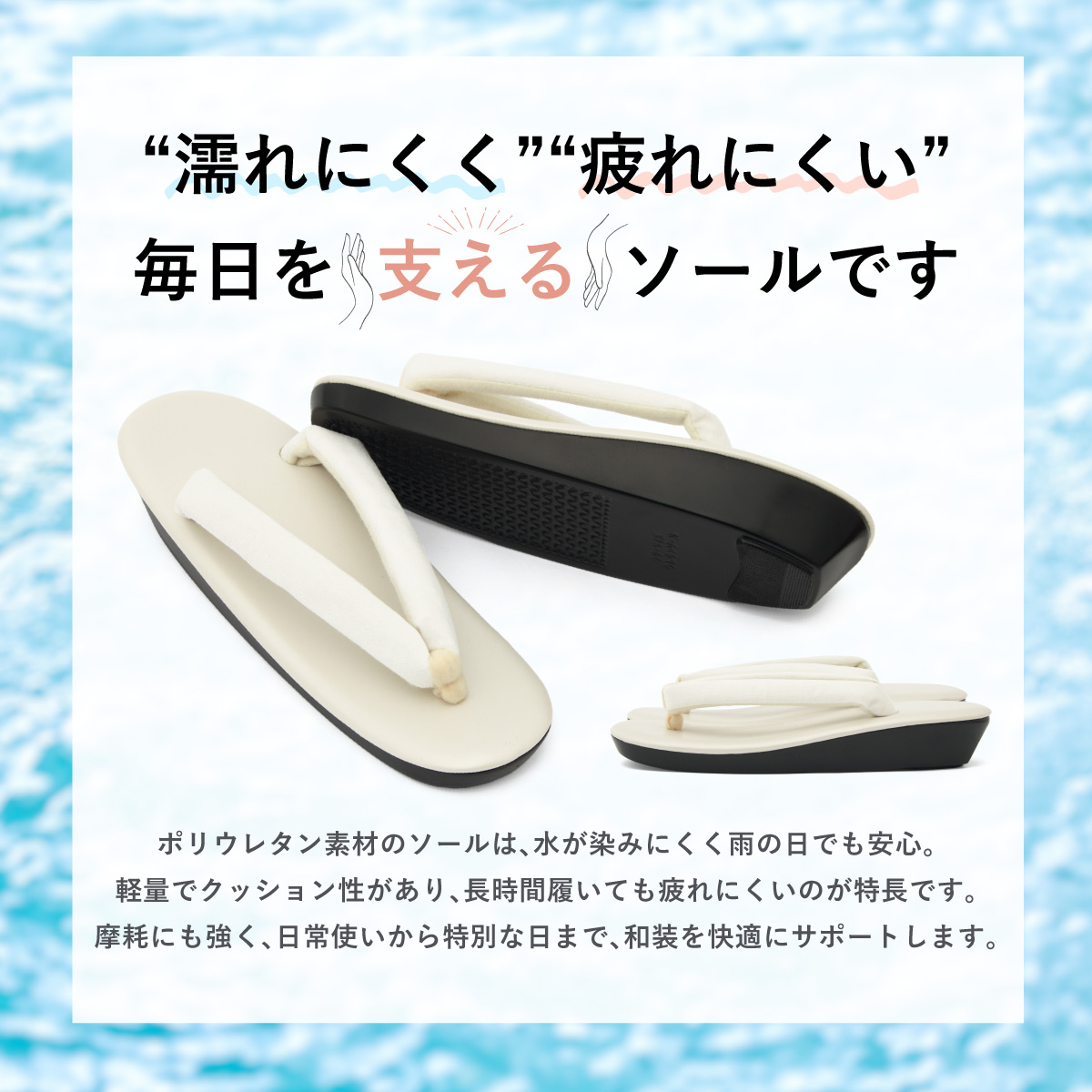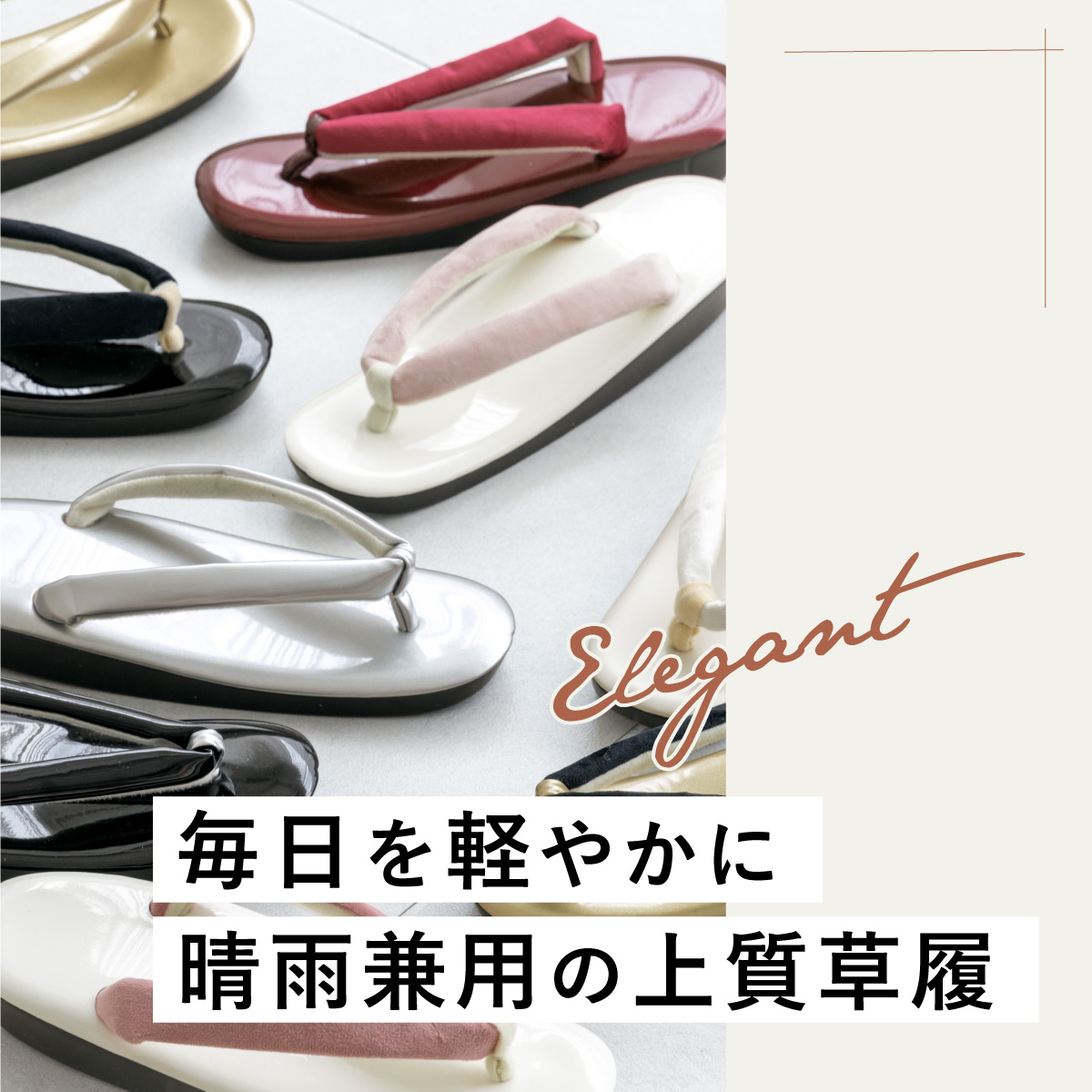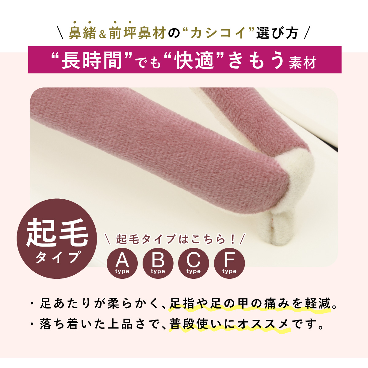 普段履きとしてお使いいただけることはもちろん、底面には滑り止め加工が施されていますのでちょっとした雨の日でもお出かけできます。鼻緒裏には、起毛素材が施されています。足の出し入れがしやすく、靴擦れも防止します。おしゃれと実用性に優れたこちらの草履で、あなただけの素敵な和装をお楽しみください。