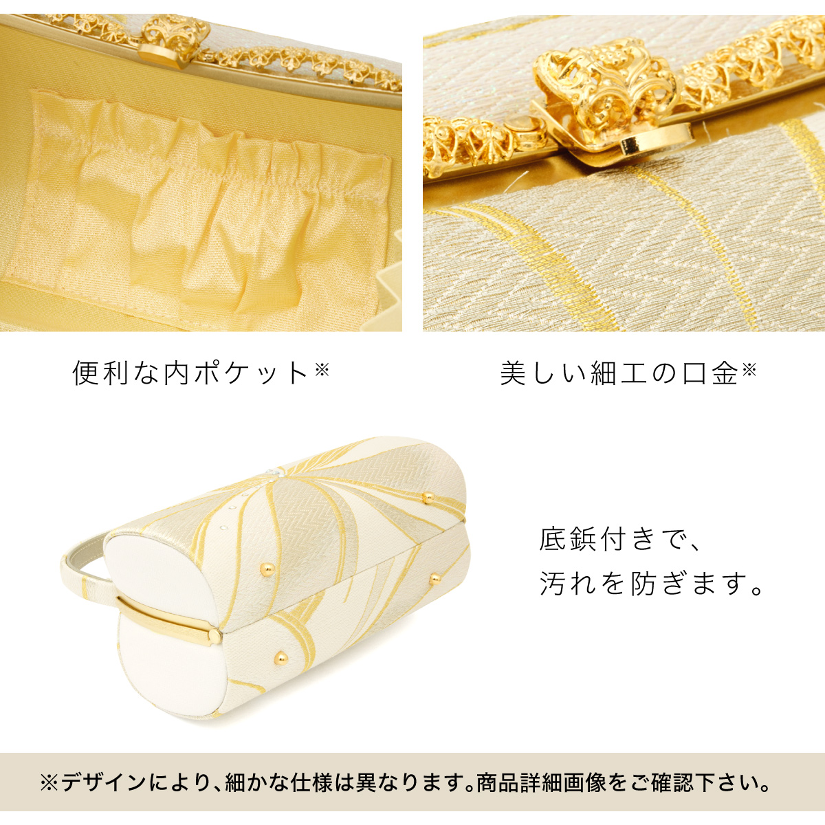 バッグの開口部分は、装飾を施した金色のフレームです。口が大きく開きますので、中身が一目で分かり、物の出し入れにも便利です。パチンとしっかり閉まり、持ち運びの上でも安心感があります。お財布などが収納できる実用的な大きさです。内側には名刺サイズのコンパクトなポケットもついております。底面には4点の底鋲も施され、テーブルなどに置いた際に汚れが付くのを防ぎます。