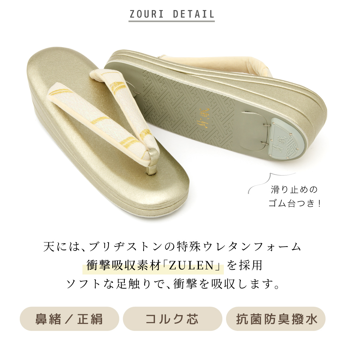 三枚芯の草履の台には適度なクッション性があり、歩行中における足腰への負担を軽減する、ブリヂストンが開発した特殊ウレタンフォーム素材を使用しています。鼻緒裏には、足の出し入れがしやすく、鼻緒ずれも防止する起毛素材が施されています。裏底には、滑り止めのゴム台が付いています。おしゃれを足下から引き立てるだけでなく、快適な着物姿をサポートします。