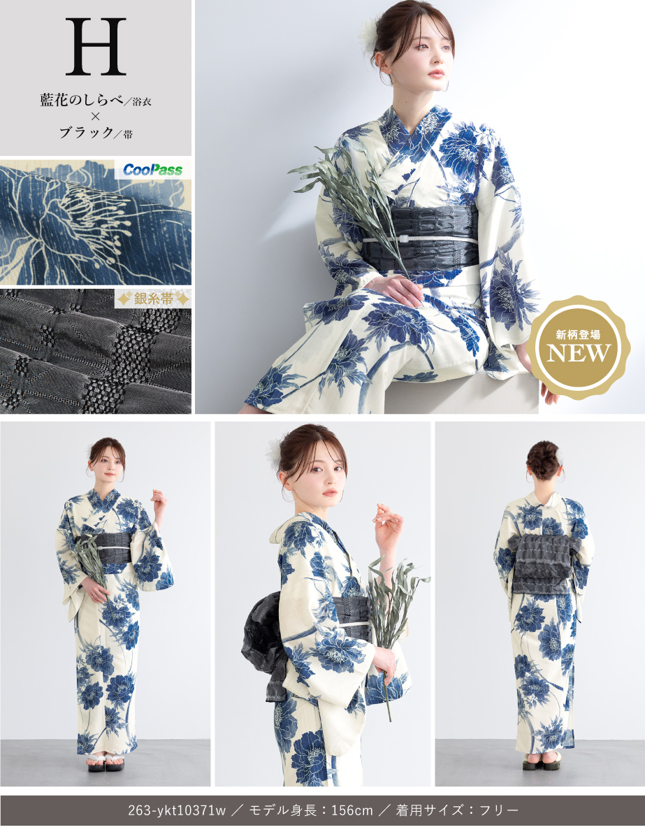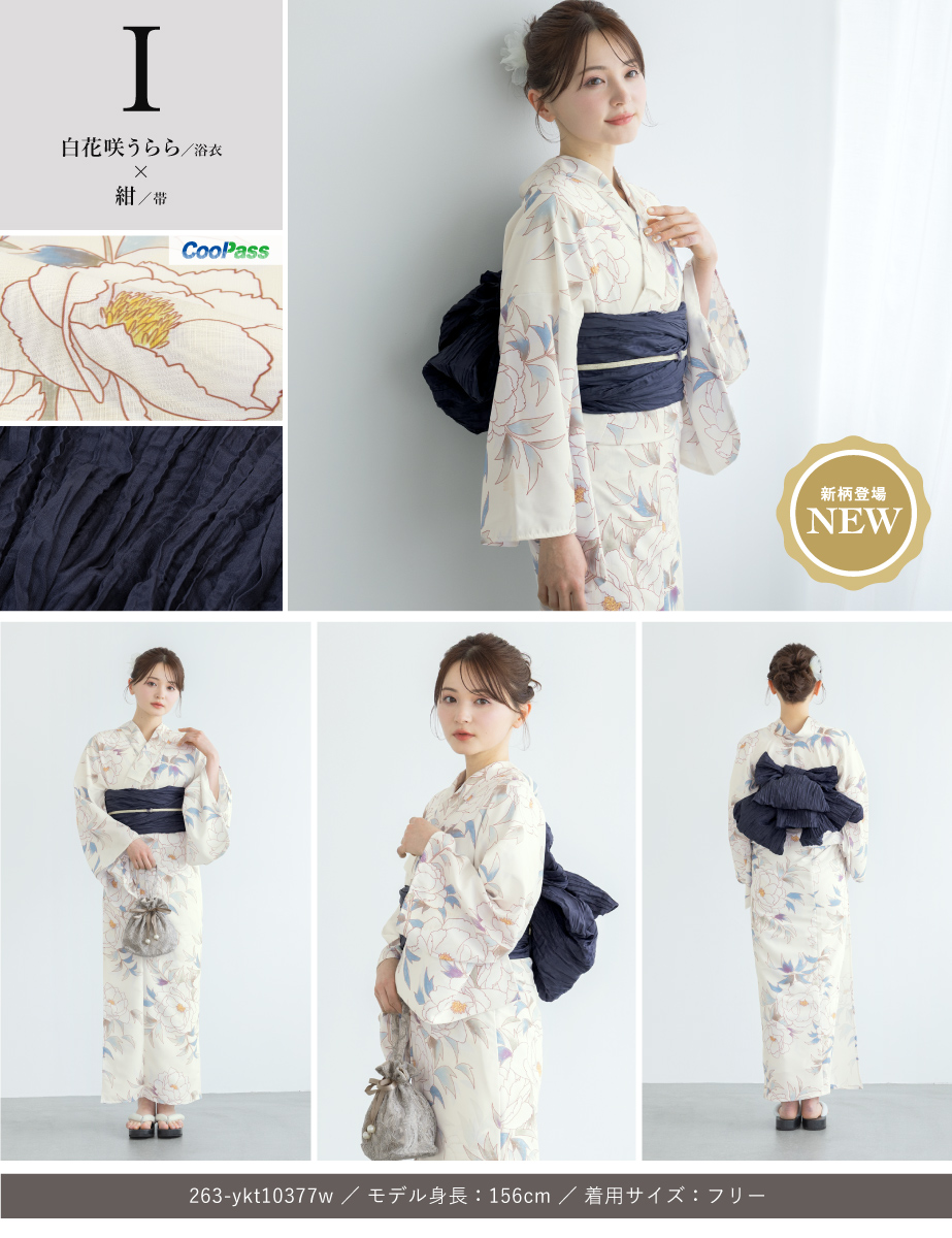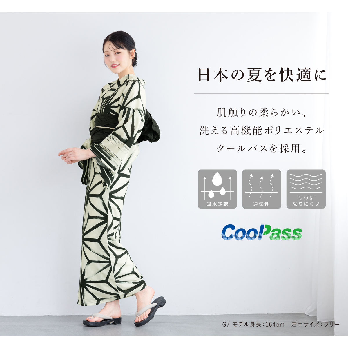 コーディネート済みの女性用浴衣2点セットです。生地は変わり織りで、ひんやりとした肌触りで、吸汗性と速乾性の繊維のCoolPassを使用しています。適度な透け感と軽さで、熱気や湿気をすっと逃がしてくれます。お祭りや花火大会など夏のお出かけの際、清涼感のある着心地が続きます。