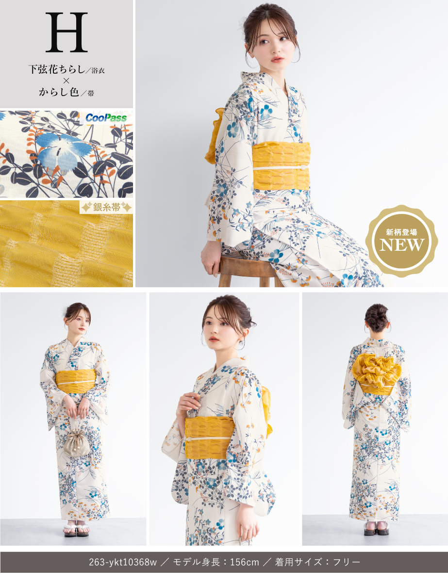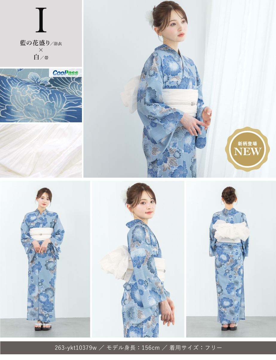 コーディネート済みの女性用浴衣2点セットです。生地は変わり織りで、ひんやりとした肌触りで、吸汗性と速乾性の繊維のCoolPassを使用しています。適度な透け感と軽さで、熱気や湿気をすっと逃がしてくれます。お祭りや花火大会など夏のお出かけの際、清涼感のある着心地が続きます。