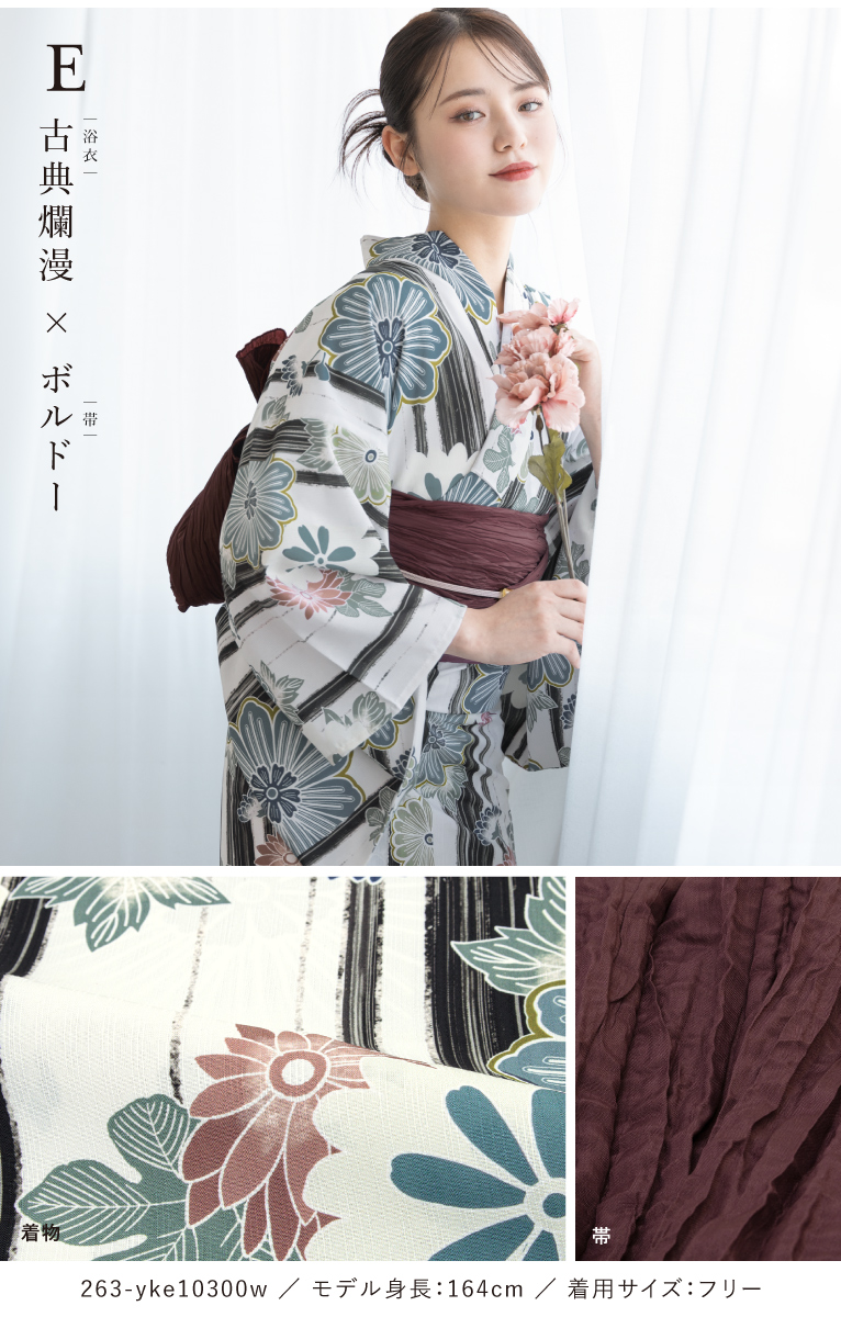 SOUBIENのプライベートブランド『floro by SOUBIEN』(フローロ)の浴衣を合わせた華やかな浴衣セットです。『floro by SOUBIEN』は、移りゆく和装トレンドの最先端を常に追い求め「欲しい」「着てみたい」を作り出す、SOUBIENのプライベートブランドです。ジャンルや系統に縛られず、あらゆるシーンに求められる和装スタイルを展開し、今流行りを押さえ、和装のお洒落を魅せたいという想いをコンセプトに真心を込めて作りました。