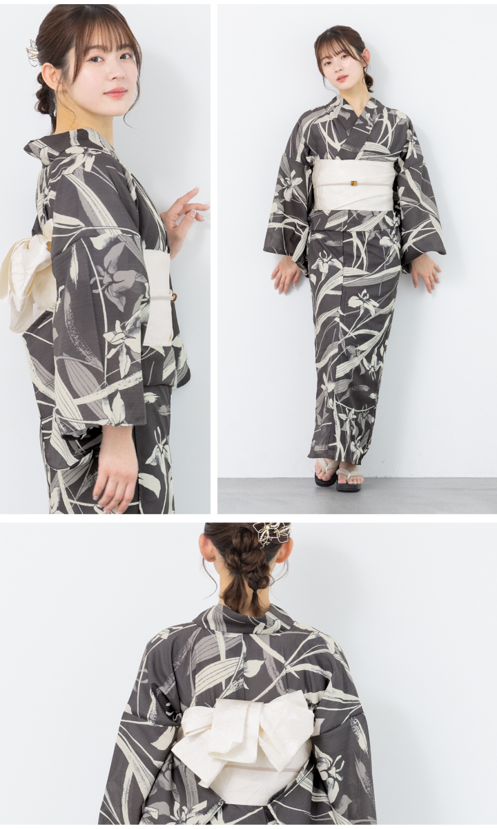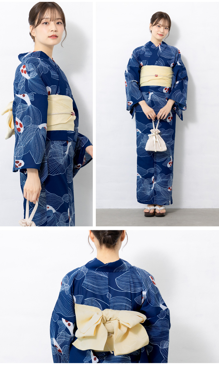 コーディネート済みのセパレート浴衣3点セットです。生地は変わり織りで、ひんやりとした肌触りで、吸汗性と速乾性の繊維のCoolPassを使用しています。適度な透け感と軽さで、熱気や湿気をすっと逃がしてくれます。お祭りや花火大会など夏のお出かけの際、清涼感のある着心地が続きます。