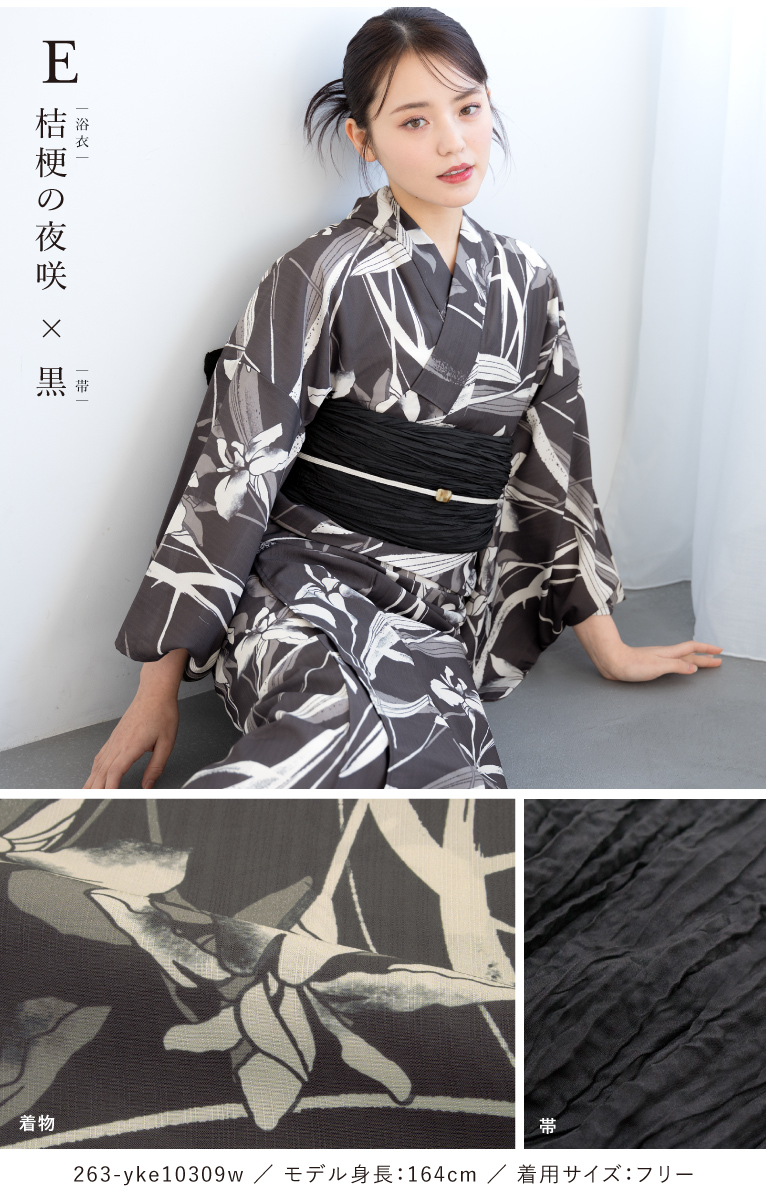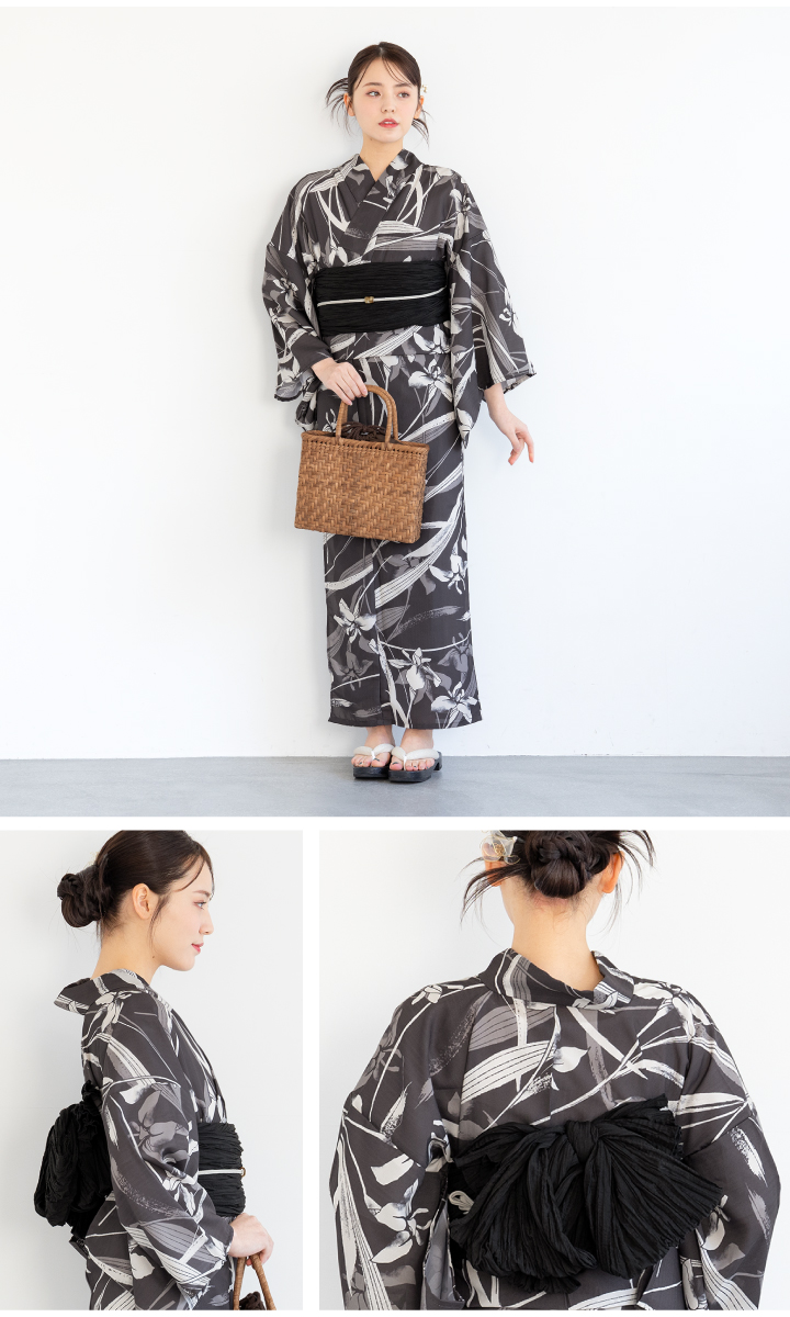 コーディネート済みのセパレート浴衣3点セットです。生地は変わり織りで、ひんやりとした肌触りで、吸汗性と速乾性の繊維のCoolPassを使用しています。適度な透け感と軽さで、熱気や湿気をすっと逃がしてくれます。お祭りや花火大会など夏のお出かけの際、清涼感のある着心地が続きます。