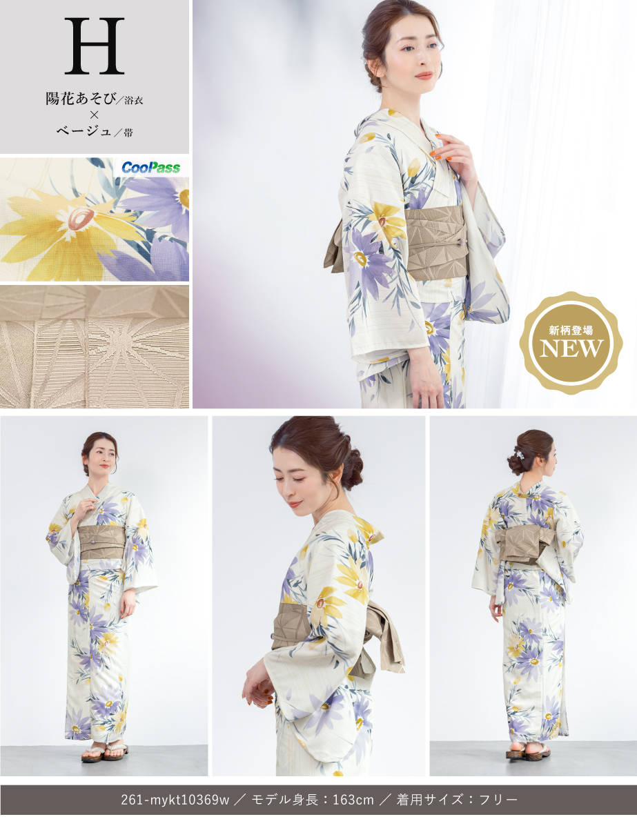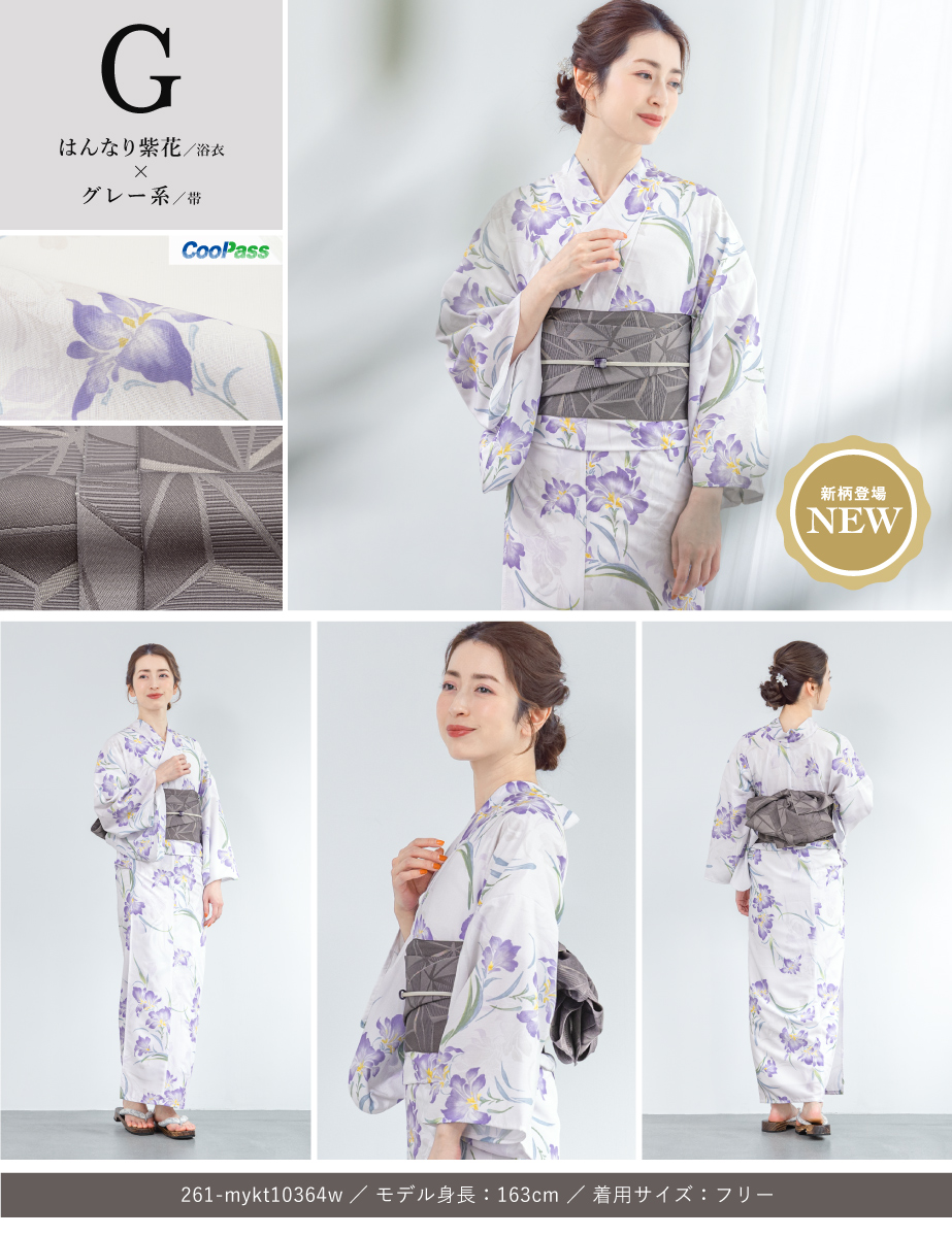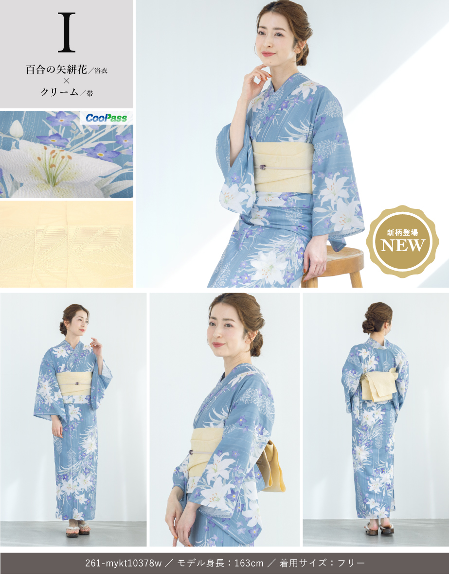 コーディネート済みの女性用浴衣2点セットです。生地は変わり織りで、ひんやりとした肌触りで、吸汗性と速乾性の繊維のCoolPassを使用しています。適度な透け感と軽さで、熱気や湿気をすっと逃がしてくれます。お祭りや花火大会など夏のお出かけの際、清涼感のある着心地が続きます。