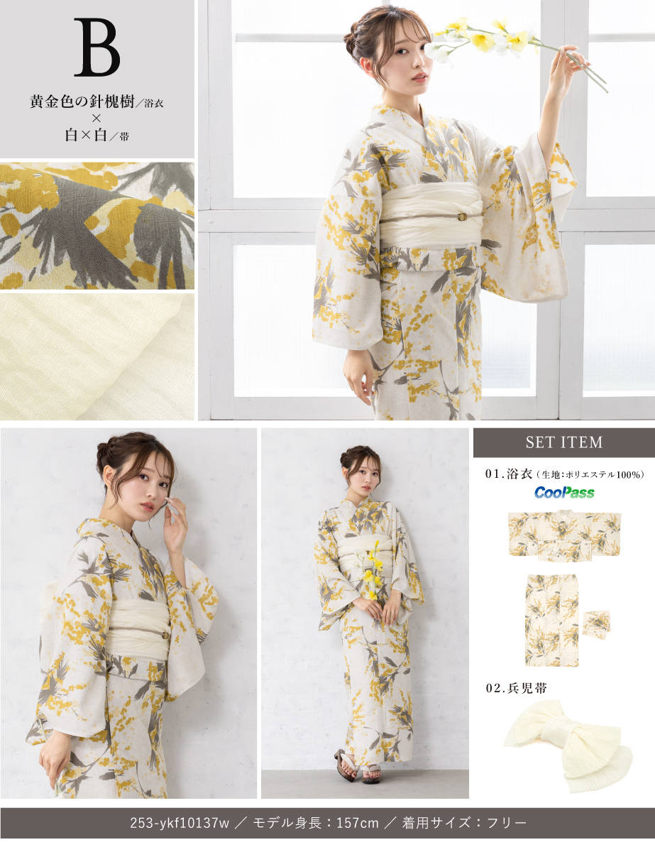 コーディネート済みのセパレート浴衣3点セットです。生地は変わり織りで、ひんやりとした肌触りで、吸汗性と速乾性の繊維のCoolPassを使用しています。適度な透け感と軽さで、熱気や湿気をすっと逃がしてくれます。お祭りや花火大会など夏のお出かけの際、清涼感のある着心地が続きます。