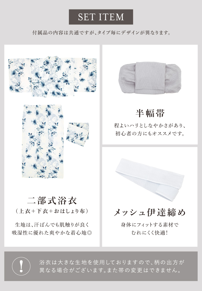 ※製造の都合上、浴衣とおはしょり布の色味が若干異なる場合があります。予めご了承ください。