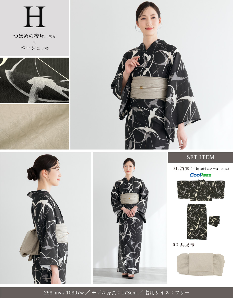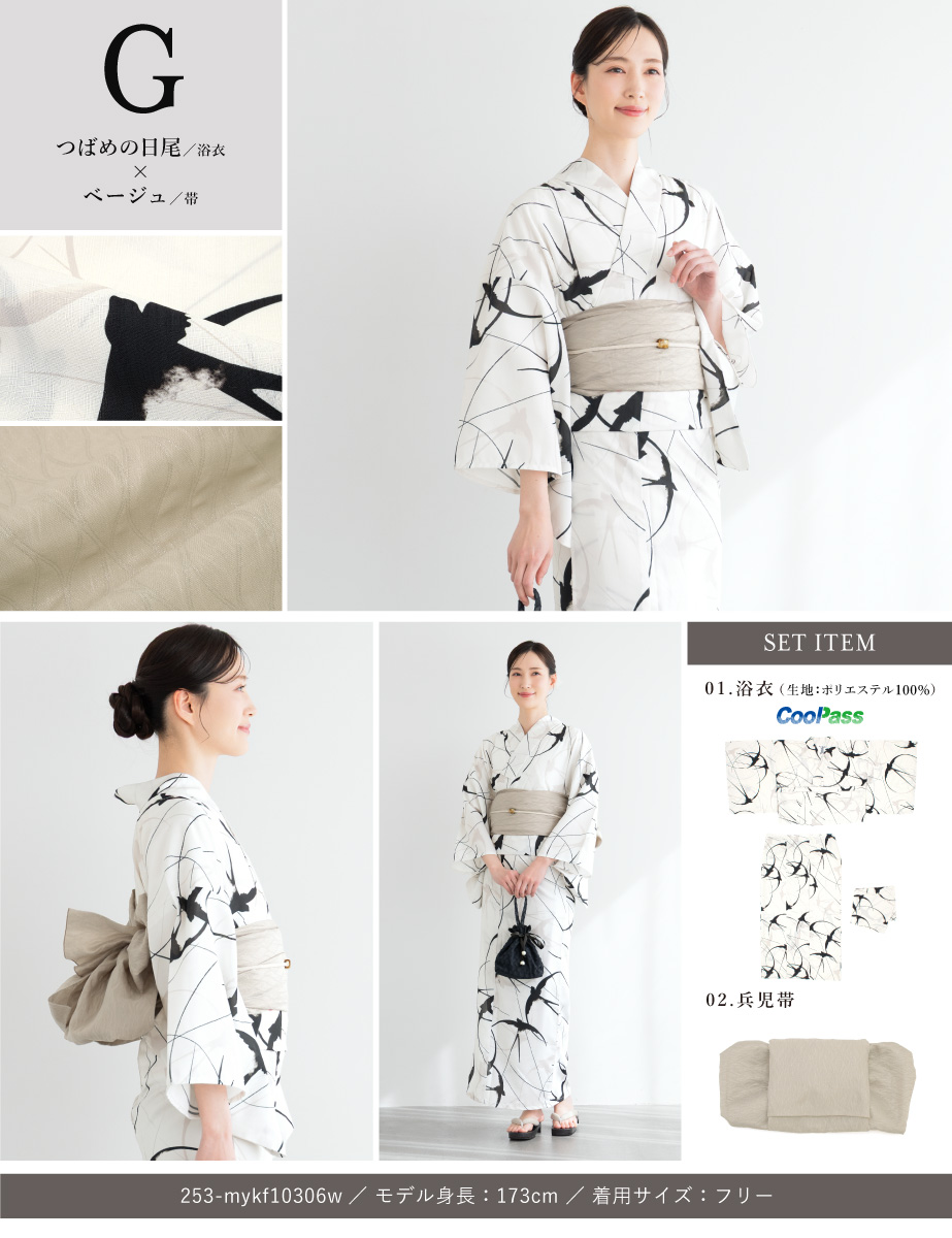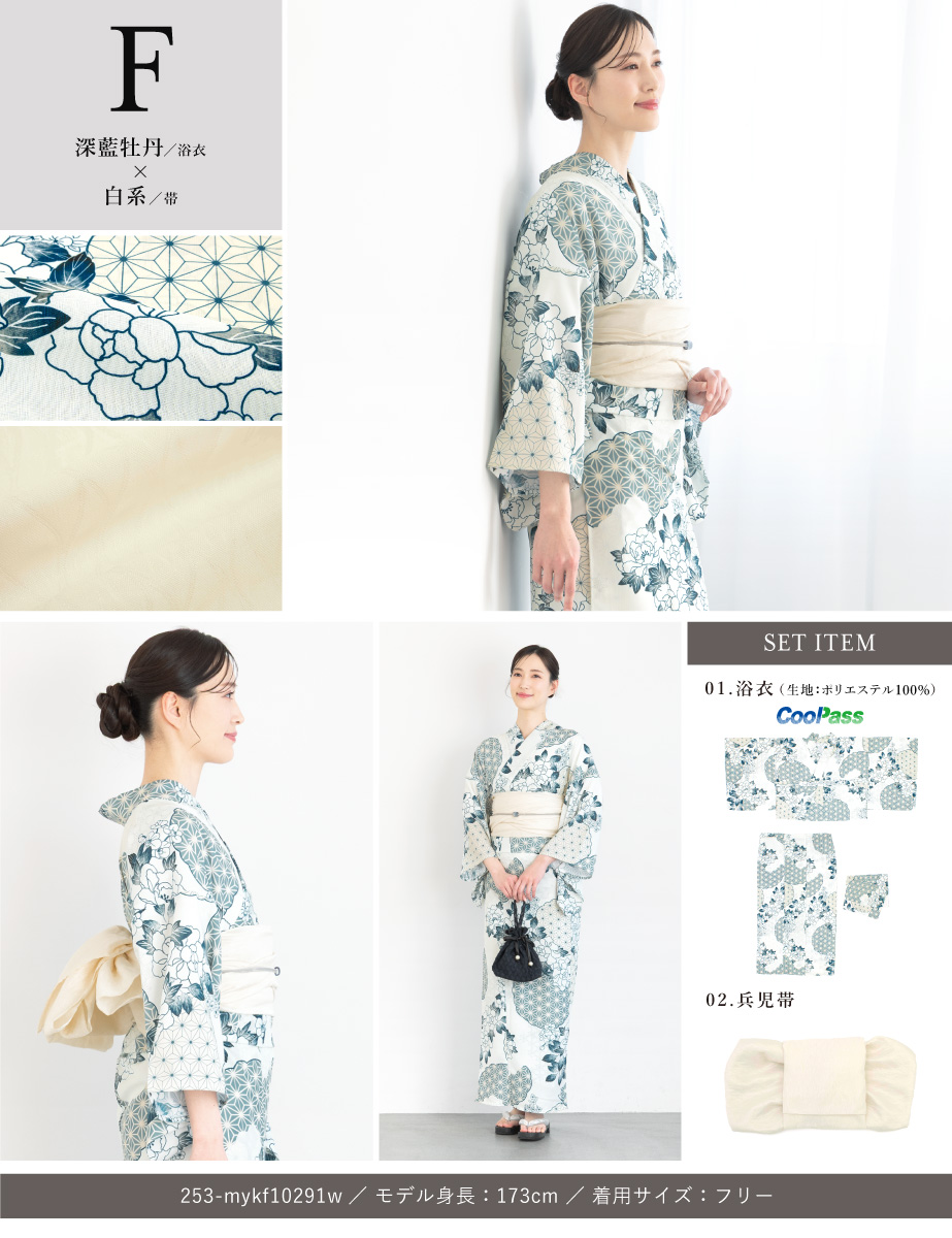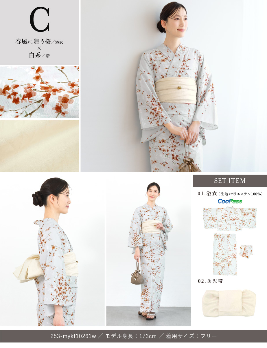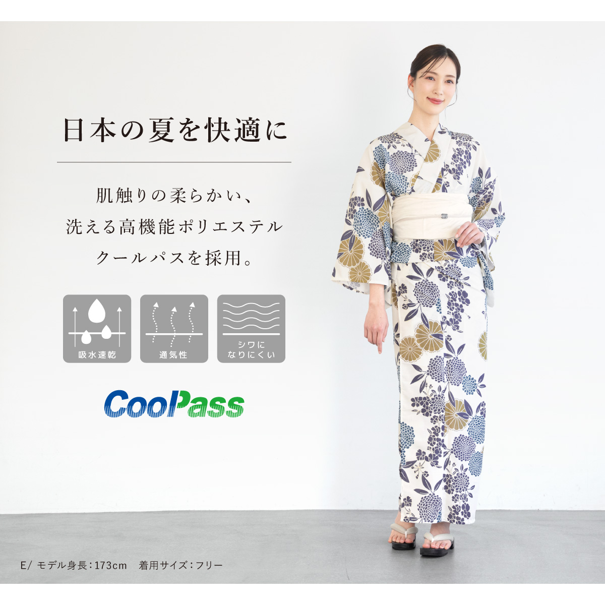 コーディネート済みのセパレート浴衣3点セットです。生地は変わり織りで、ひんやりとした肌触りで、吸汗性と速乾性の繊維のCoolPassを使用しています。適度な透け感と軽さで、熱気や湿気をすっと逃がしてくれます。お祭りや花火大会など夏のお出かけの際、清涼感のある着心地が続きます。