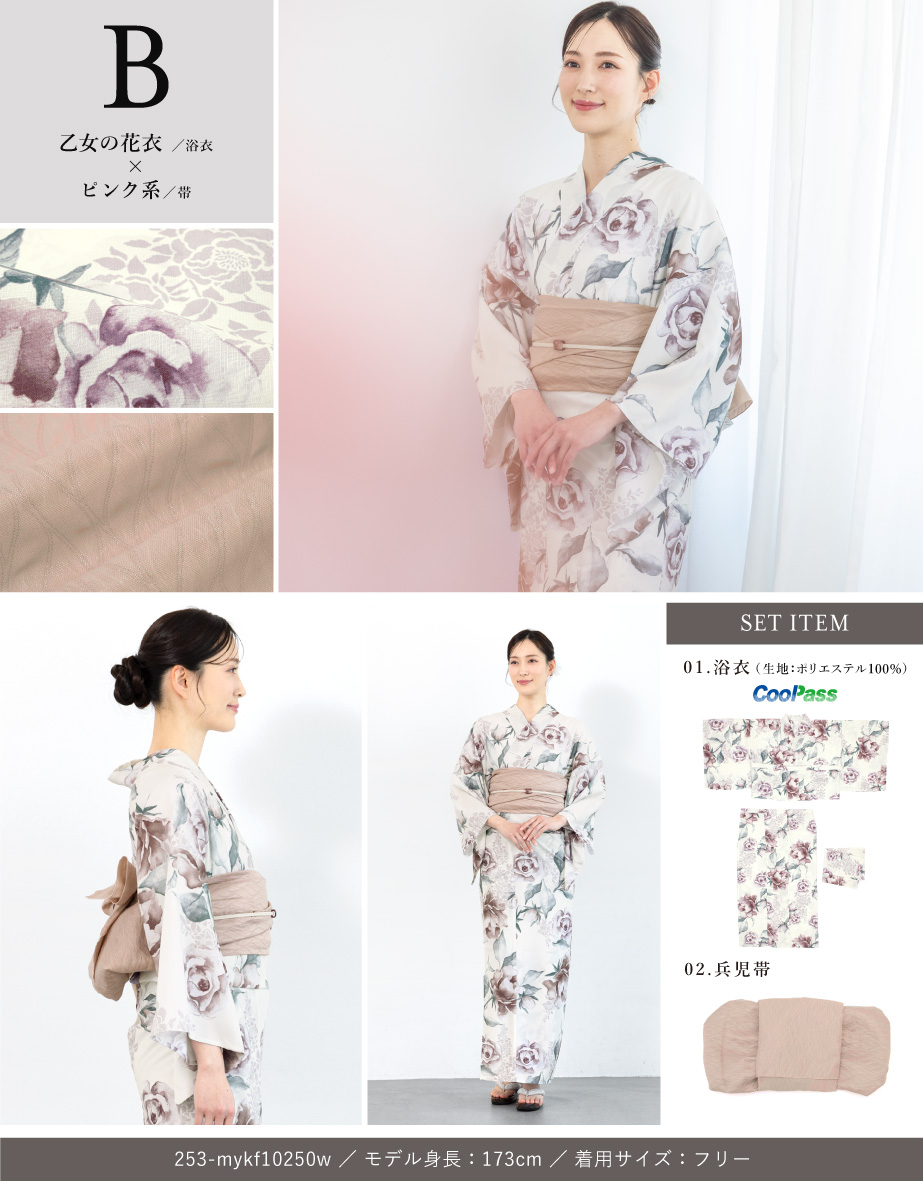 SOUBIENのプライベートブランド『floro by SOUBIEN』(フローロ)の浴衣を合わせた華やかな浴衣セットです。『floro by SOUBIEN』は、移りゆく和装トレンドの最先端を常に追い求め「欲しい」「着てみたい」を作り出す、SOUBIENのプライベートブランドです。ジャンルや系統に縛られず、あらゆるシーンに求められる和装スタイルを展開し、今流行りを押さえ、和装のお洒落を魅せたいという想いをコンセプトに真心を込めて作りました。