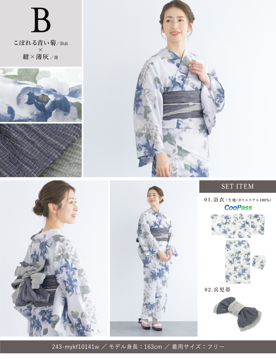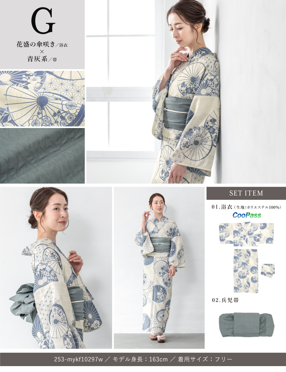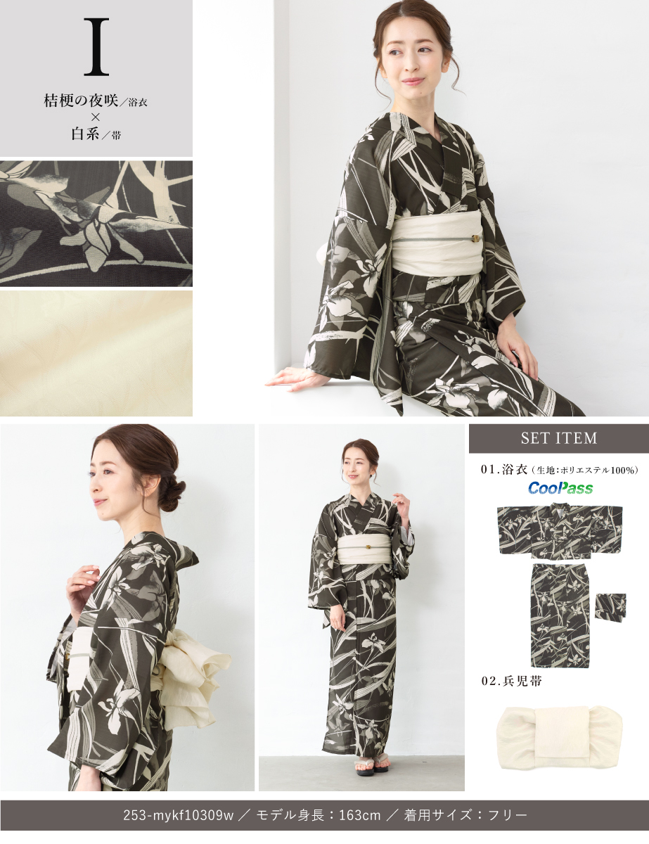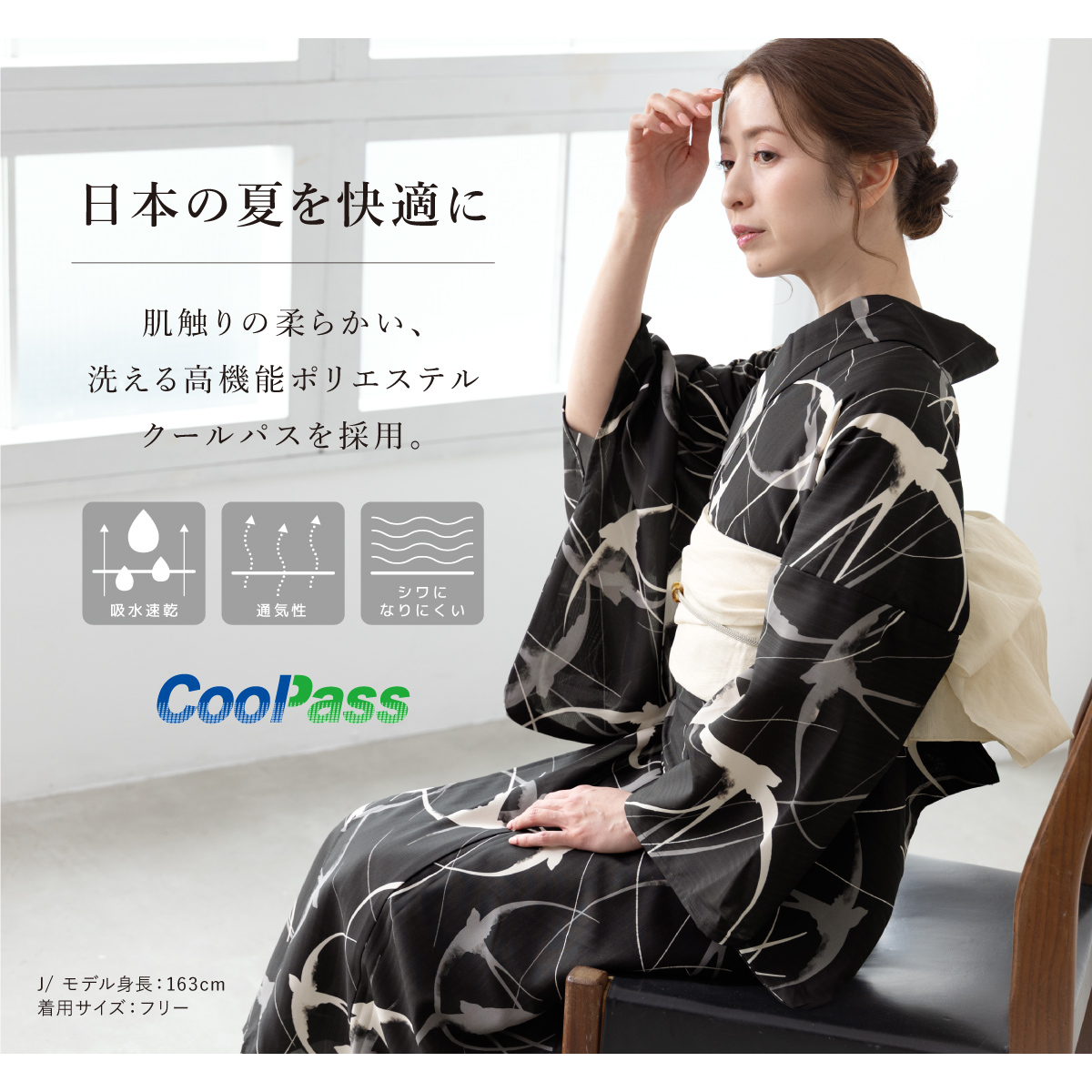 コーディネート済みのセパレート浴衣3点セットです。生地は変わり織りで、ひんやりとした肌触りで、吸汗性と速乾性の繊維のCoolPassを使用しています。適度な透け感と軽さで、熱気や湿気をすっと逃がしてくれます。お祭りや花火大会など夏のお出かけの際、清涼感のある着心地が続きます。