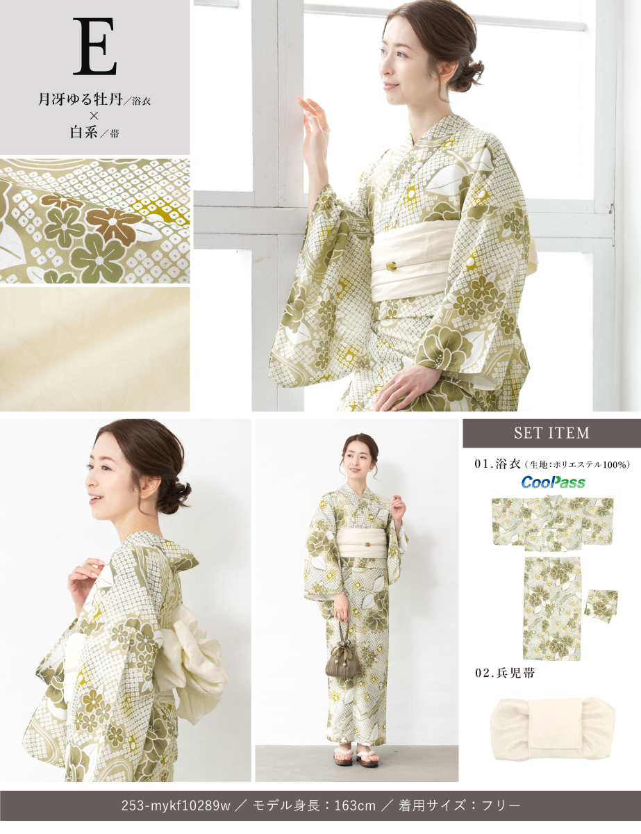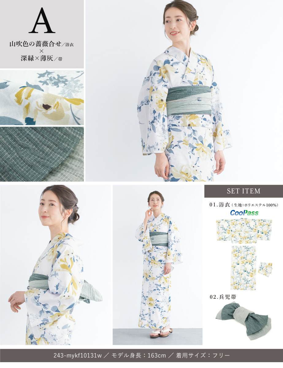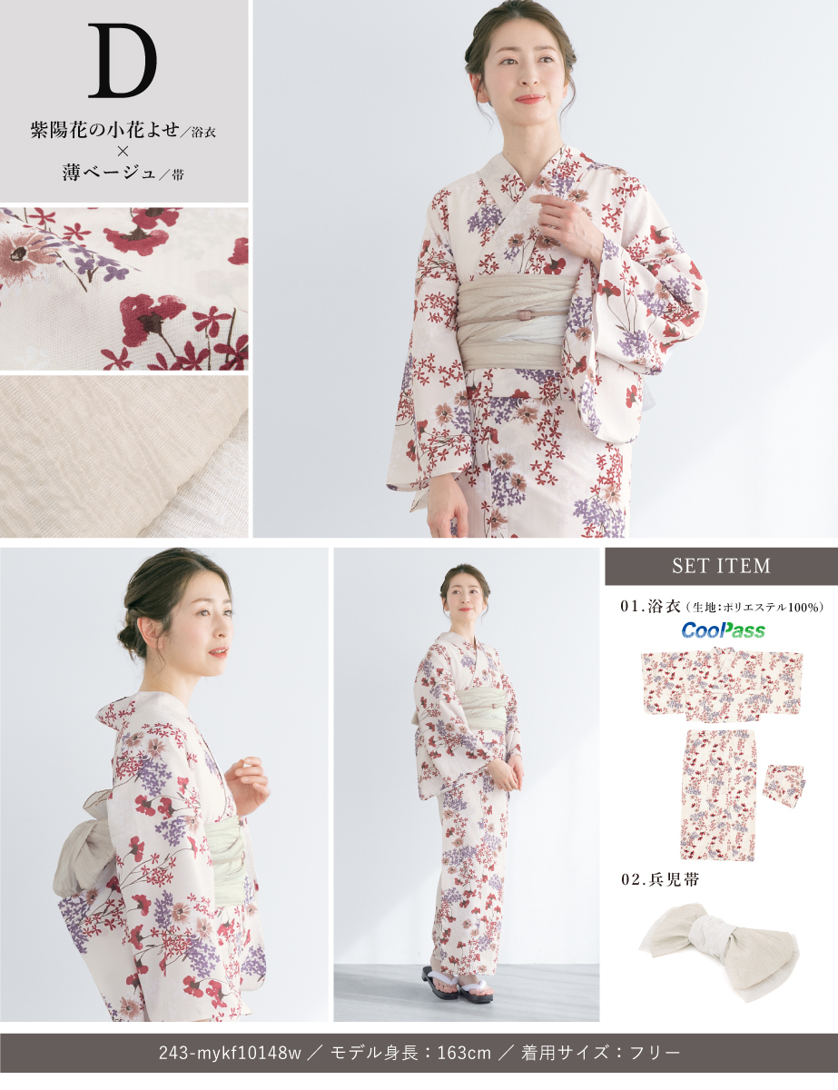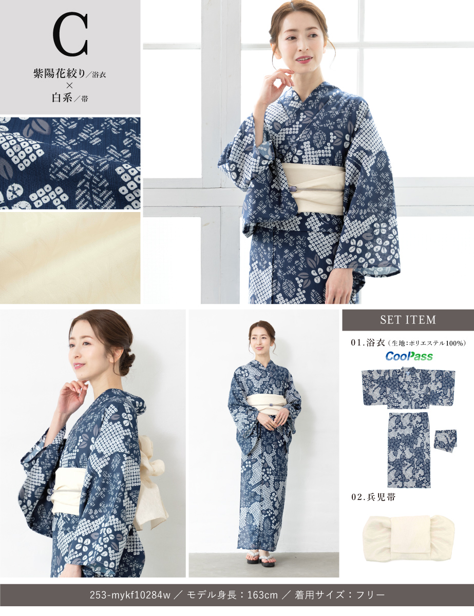 コーディネート済みのセパレート浴衣3点セットです。生地は変わり織りで、ひんやりとした肌触りで、吸汗性と速乾性の繊維のCoolPassを使用しています。適度な透け感と軽さで、熱気や湿気をすっと逃がしてくれます。お祭りや花火大会など夏のお出かけの際、清涼感のある着心地が続きます。