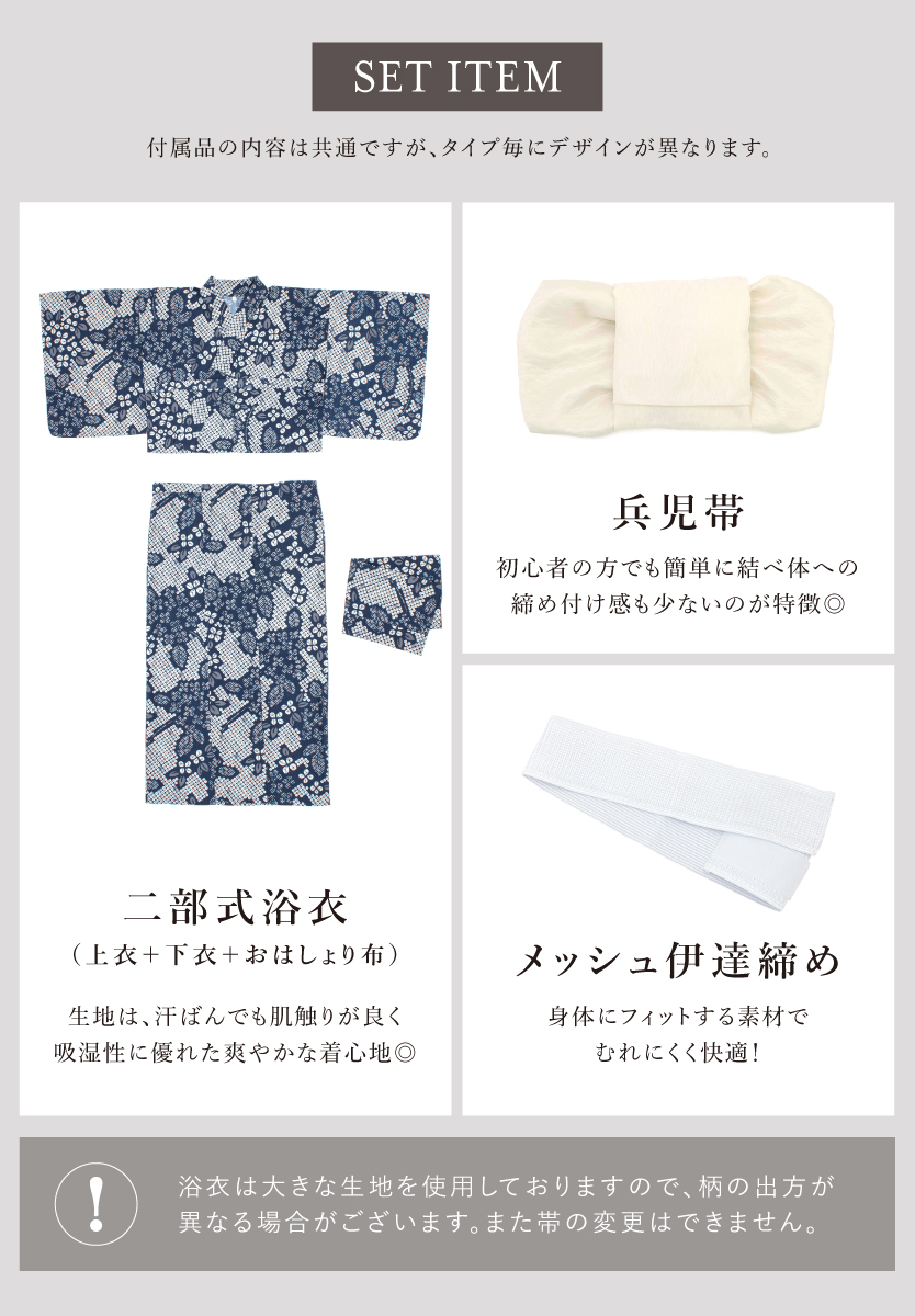 二部式浴衣(上衣+下衣+おはしょり布)・帯・伊達締め