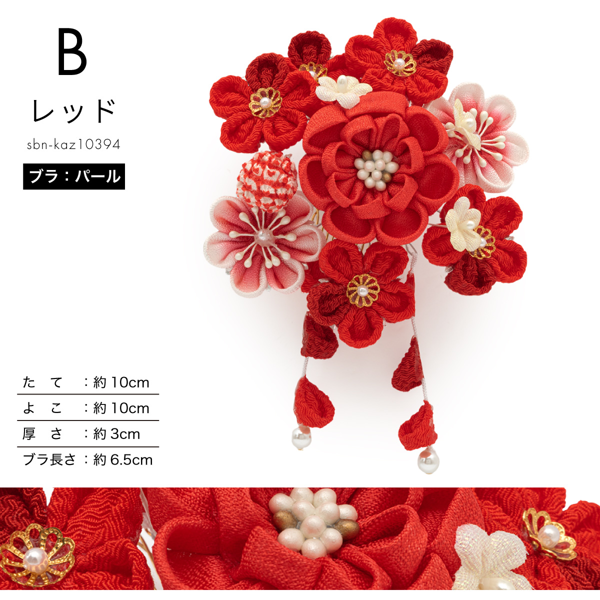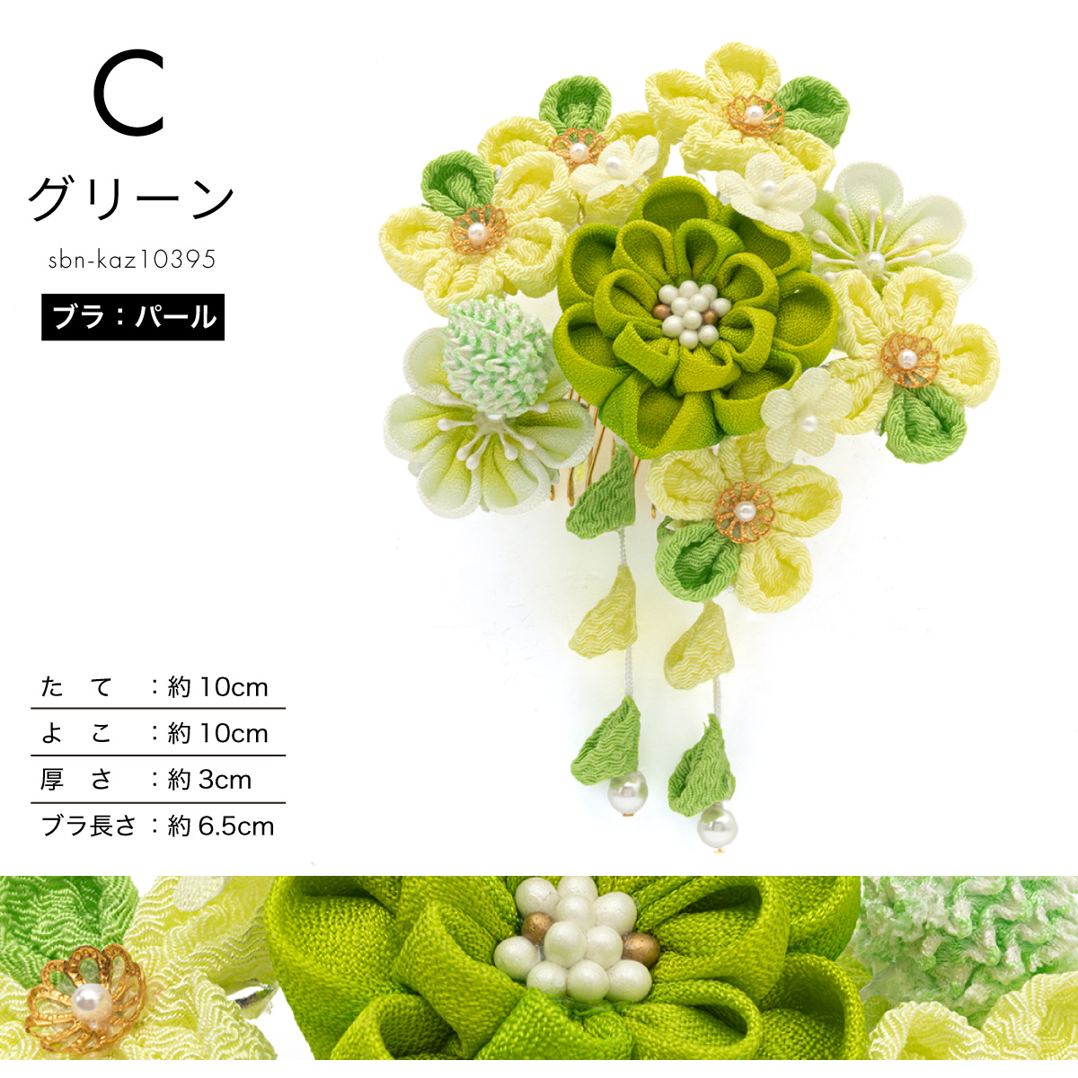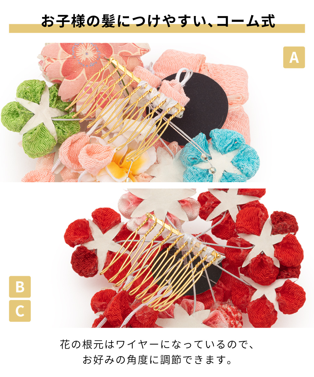 大きな髪飾りの留め具はコーム式です。花の根元はワイヤー式です。髪型のおしゃれに合わせ、お好みの角度に微調節できます。つまみ細工は、小さな生地を一つ一つ、職人が丁寧に束ね上げる伝統手芸です。精巧な花びらの造形美は、他の髪飾りにはない魅力があります。
