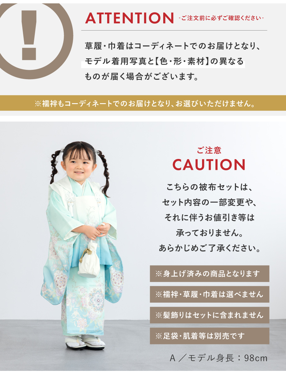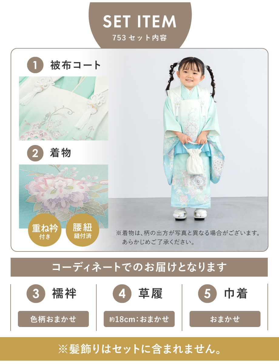 ※襦袢・巾着・草履の色柄や形状は当店スタッフのおまかせとなります。ご指定はいただけませんので予めご了承ください。