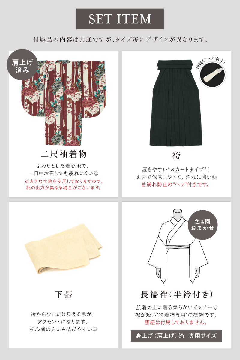 ※【着物・袴・襦袢・下帯】のセットです。セット内容の一部変更や、それに伴う値引きは承っておりません。