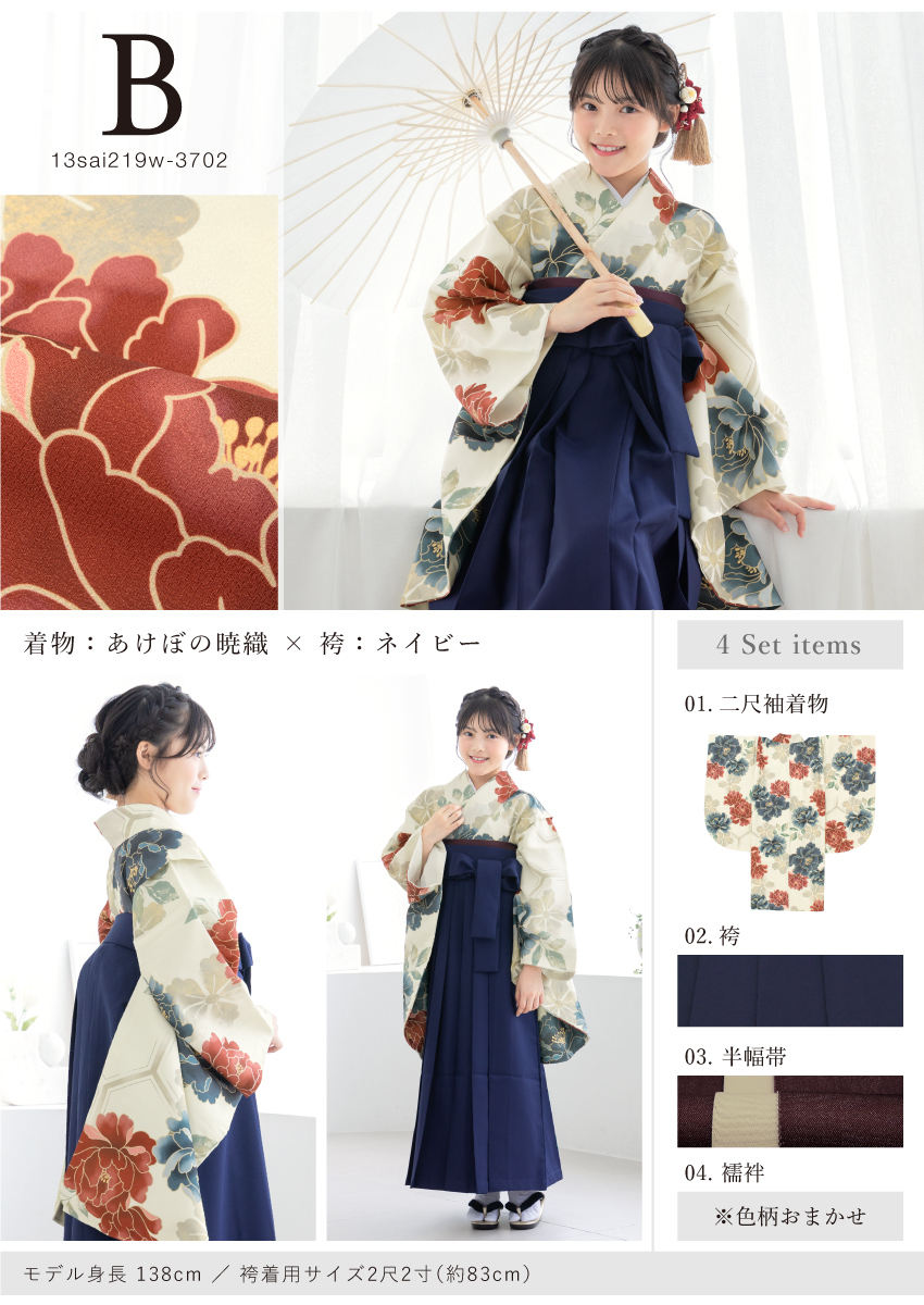 13歳ハイジュニア向けの二尺袖着物と袴の4点セット