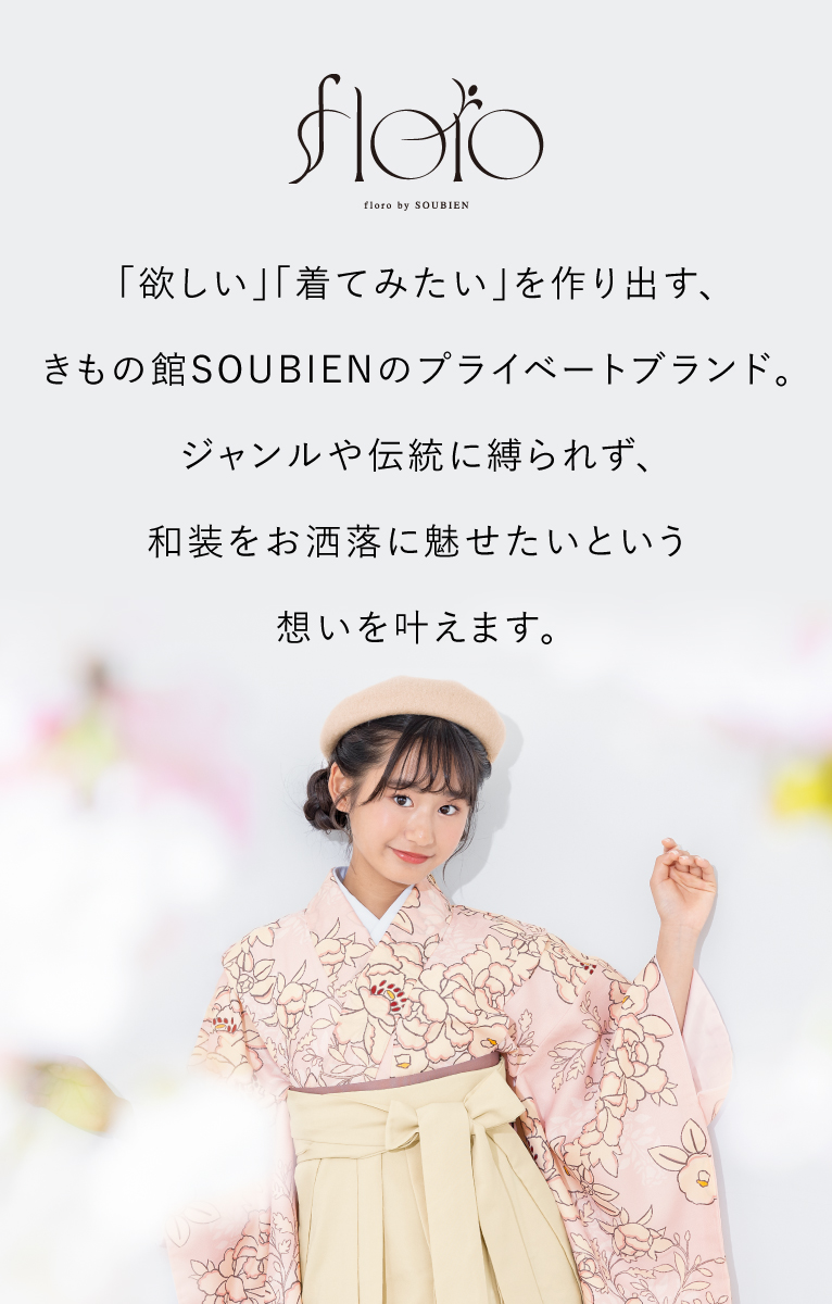 きもの館SOUBIENのプライベートブランド『floro by SOUBIEN』(フローロ)の二尺袖着物を合わせた華やかな袴セットです。『floro by SOUBIEN』(フローロ)は、移りゆく和装トレンドの最先端を常に追い求め、「欲しい」「着てみたい」を作り出す、きもの館SOUBIENのプライベートブランドです。ジャンルや系統に縛られず、あらゆるシーンに求められる和装スタイルを展開し、今流行りの人気を押さえ、和装のお洒落を魅せたいという想いをコンセプトに真心を込めて作りました。