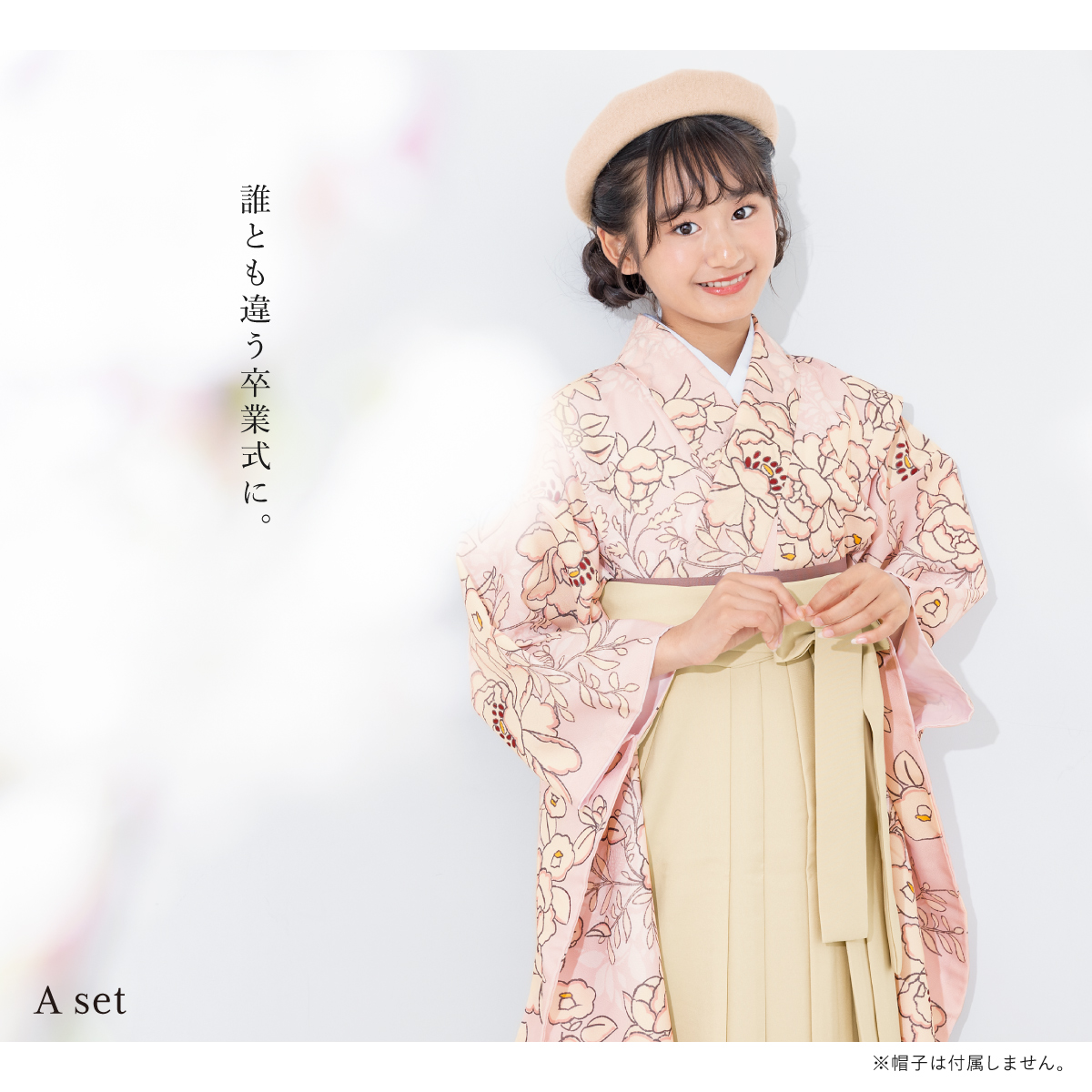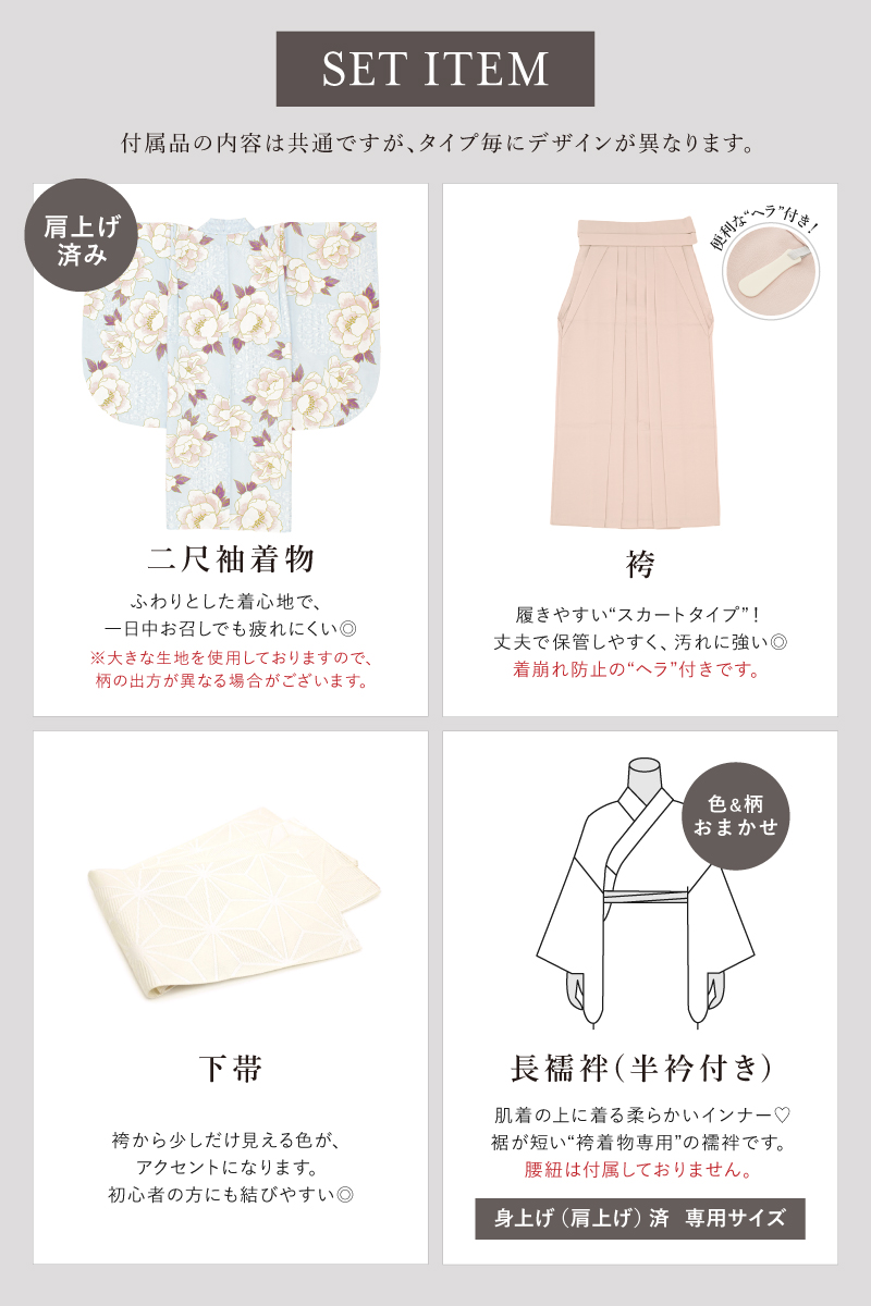 卒業式や大切な記念日を彩る袴セットです。内容は【着物・袴・下帯・襦袢】の4点セットです。着物は、身丈が短く動きやすい半着タイプです。袴は、合わせやすいシンプルな無地です。中仕切りがない行灯袴(あんどんはかま)ですので、洋服のスカートと同じようにお召しいただけます。ご自宅でもお手入れしやすいので、着物での一日を存分にお楽しみいただけます。こだわりの袴セットで、思い出となる記念日をお迎えください。