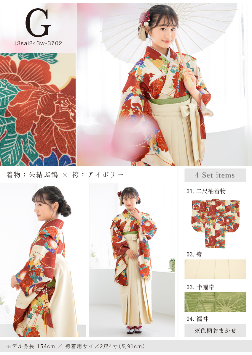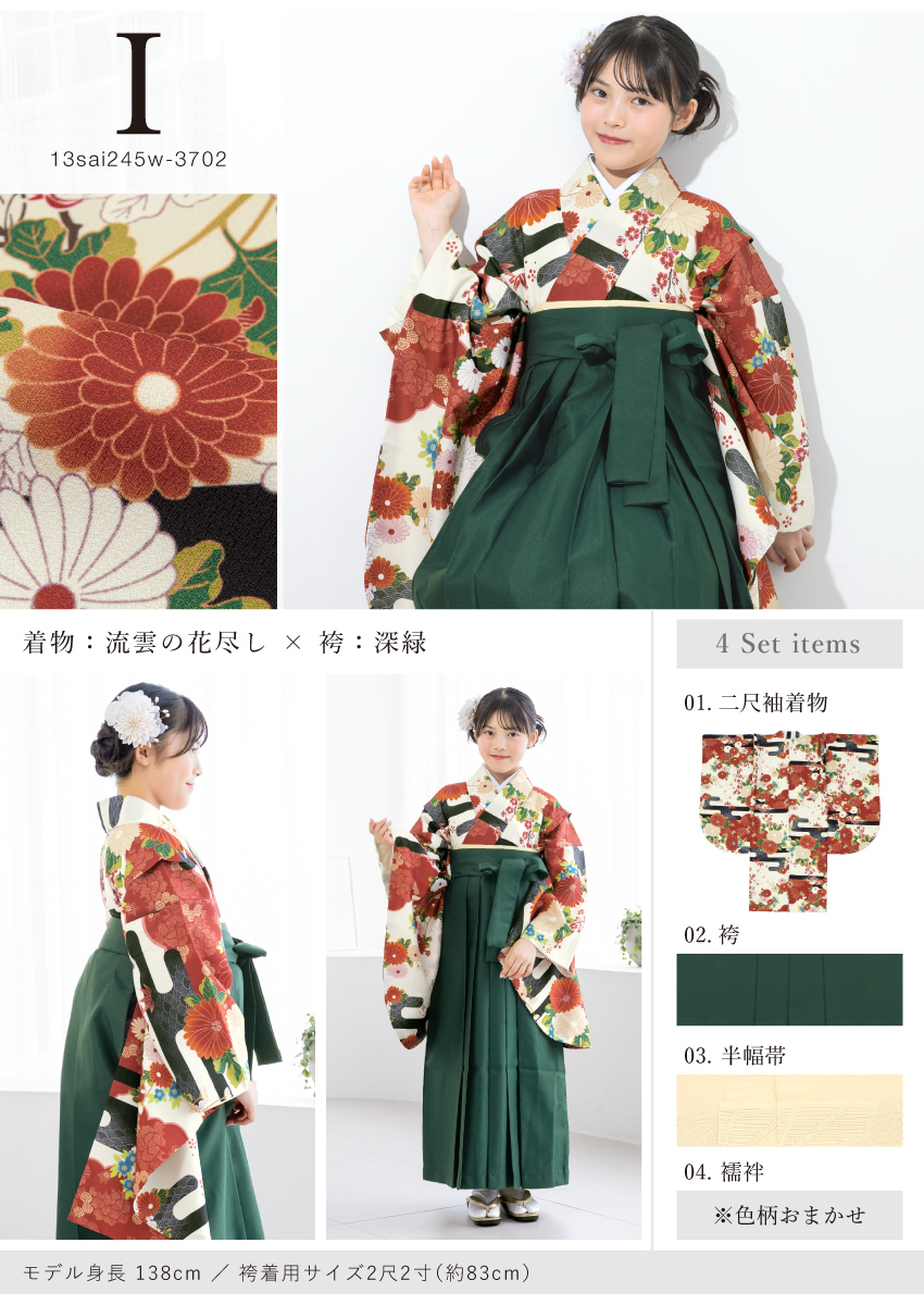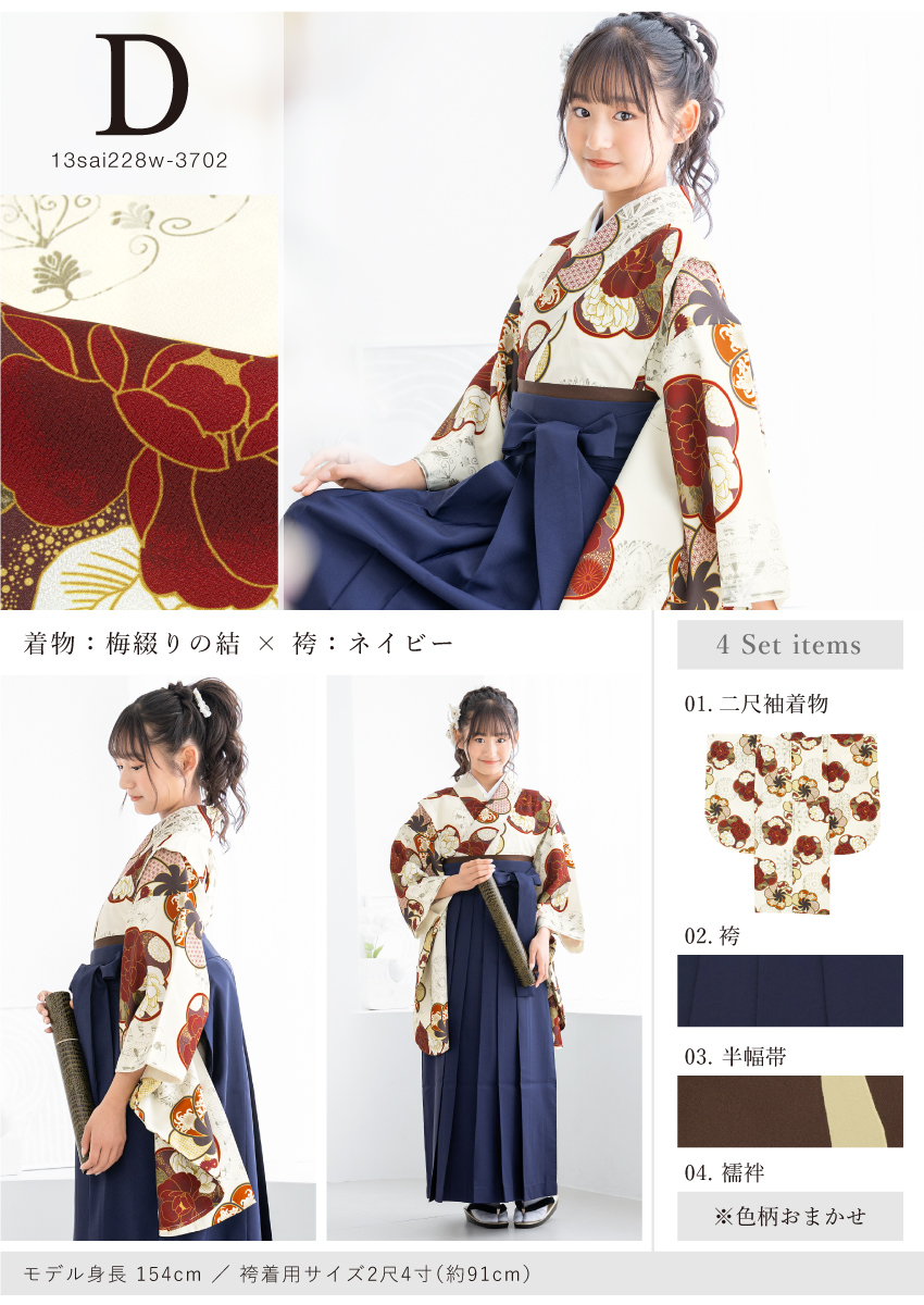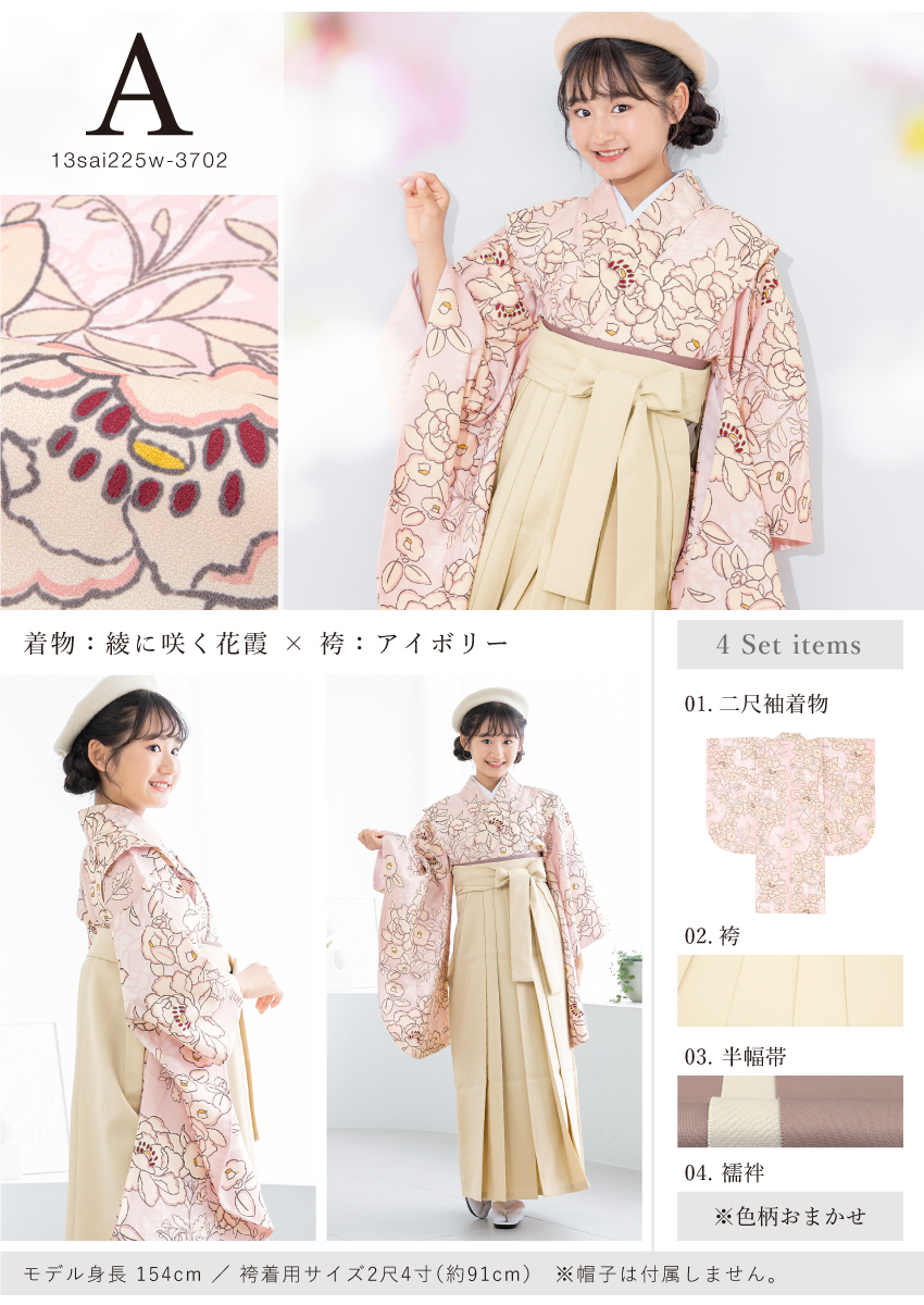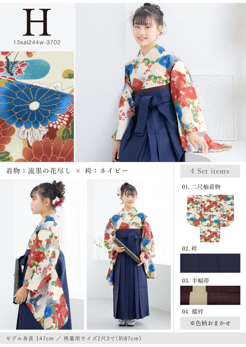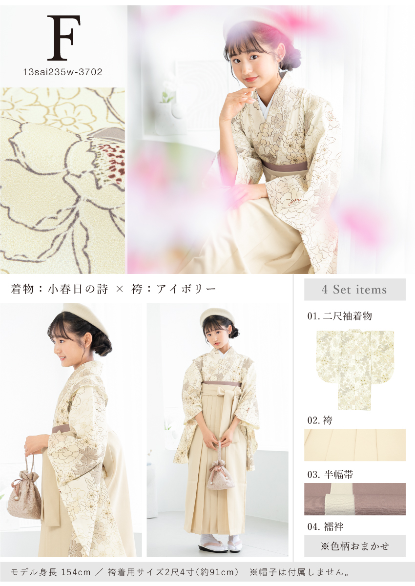 13歳ハイジュニア向けの二尺袖着物と袴の4点セット