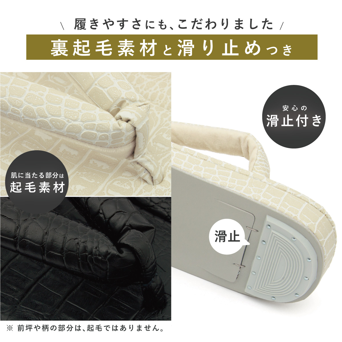 洗練されたデザインの男性用の高級雪駄です。クロコダイル調の台に、同素材の鼻緒が挿げられています。高級素材クロコダイルを模した、艶消しの型押しは高級感溢れる風合いです。カジュアルなおしゃれ着物から洋装など、幅広く合わせていただけます。
