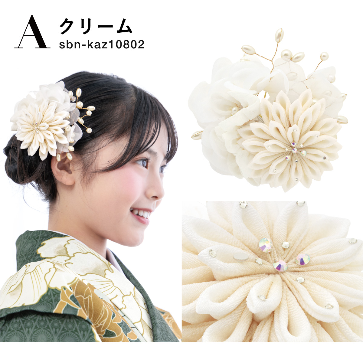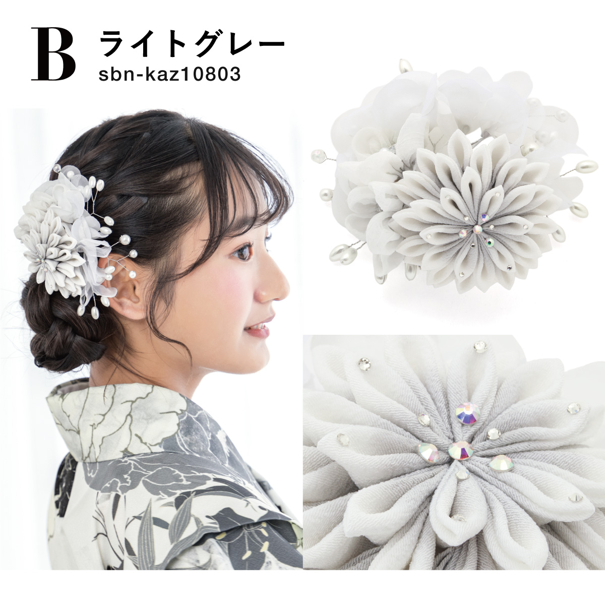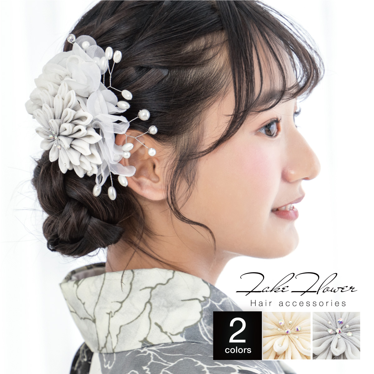 髪飾り 成人式 卒業式 クリーム 白 グレー つまみ細工 花 オーガンジー フェイクパール ヘアアクセサリー ヘアアクセ 髪留め 振袖 袴