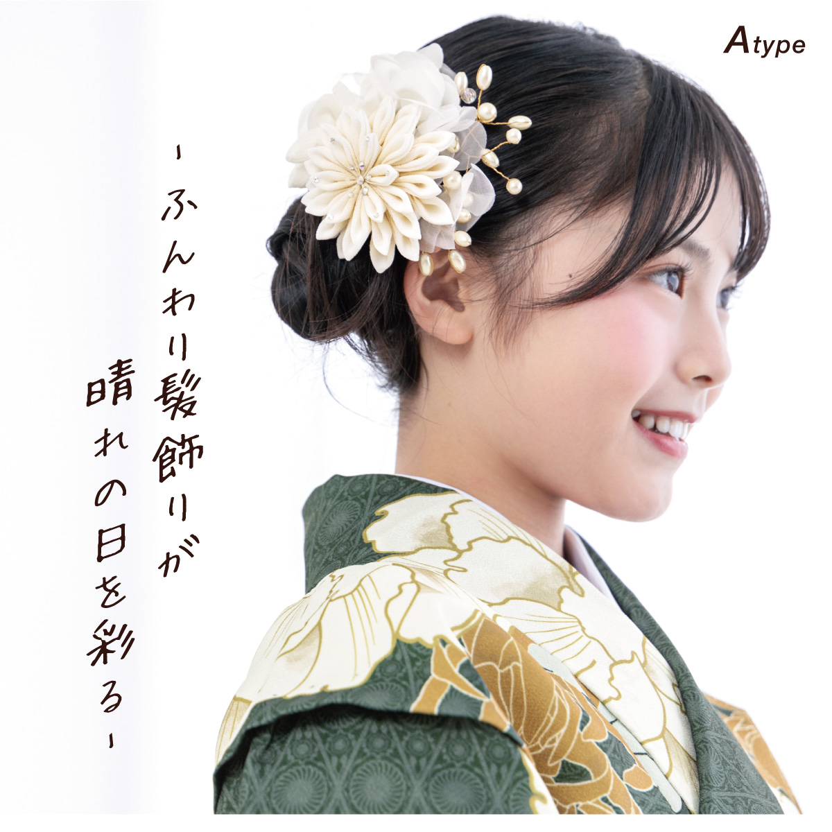 着物のヘアスタイルを彩るつまみ細工の髪飾りです。小さなラインストーンが煌めくつまみ細工の菊の花に、ふんわりとした柔らかな花々やフェイクパールの枝があしらわれています。卒業式の袴や成人式の振袖などにオススメします。
