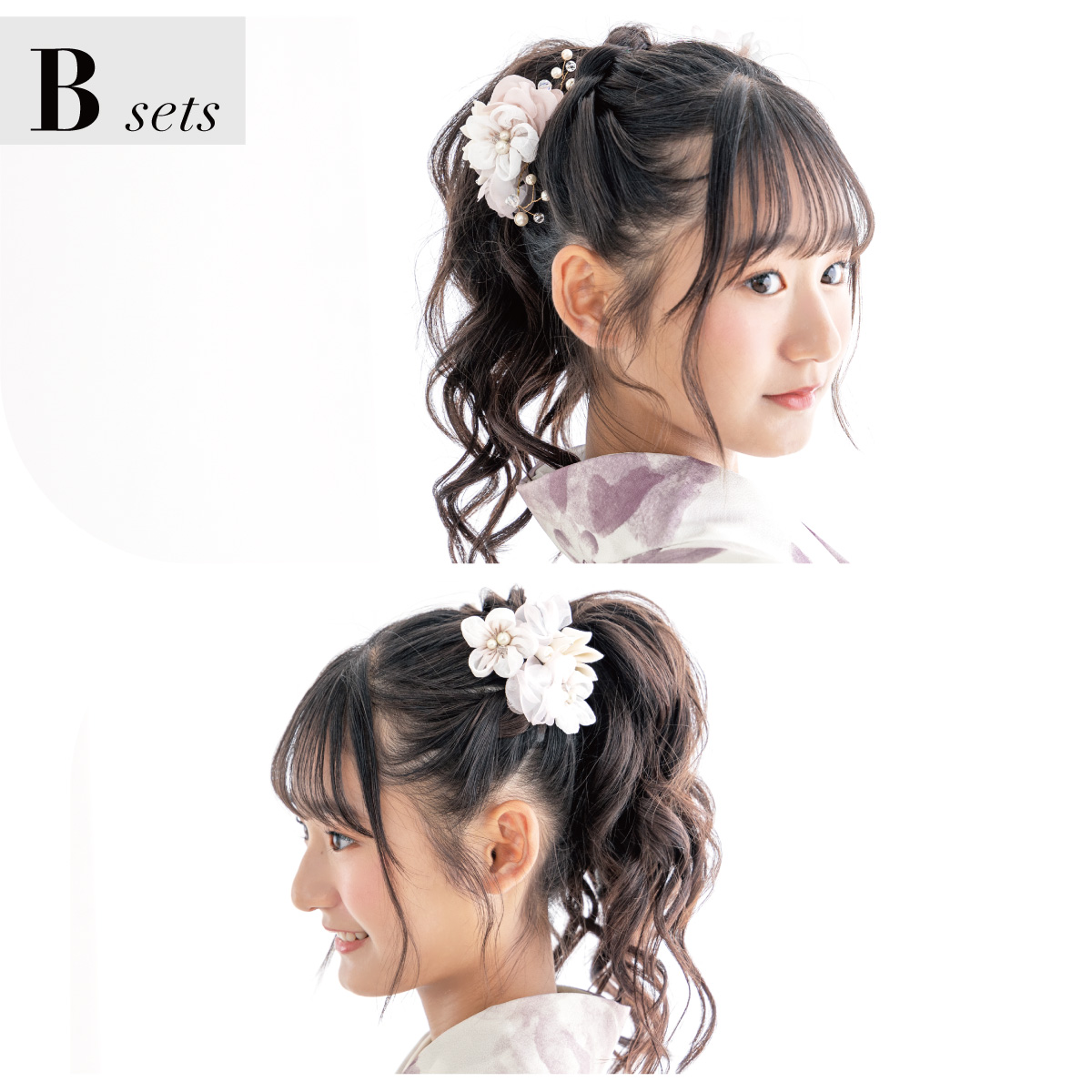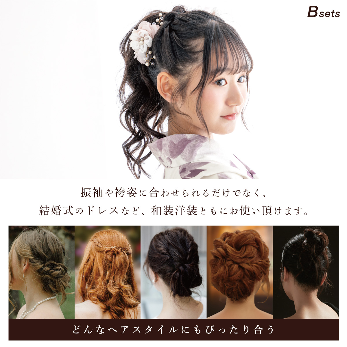 和装のヘアスタイルを彩る、花の髪飾り4点セットです。フェイクパールや小さなラインストーンが施されたつまみ細工の花々、透け感のある生地を使った花びらが美しいモダンなデザインで、ワントーンコーデが落ち着いた雰囲気です。成人式や結婚式などの振袖や、卒業式の袴姿などによくお似合いです。