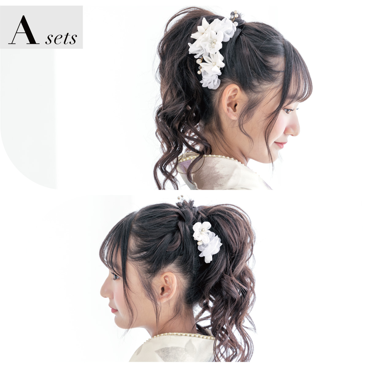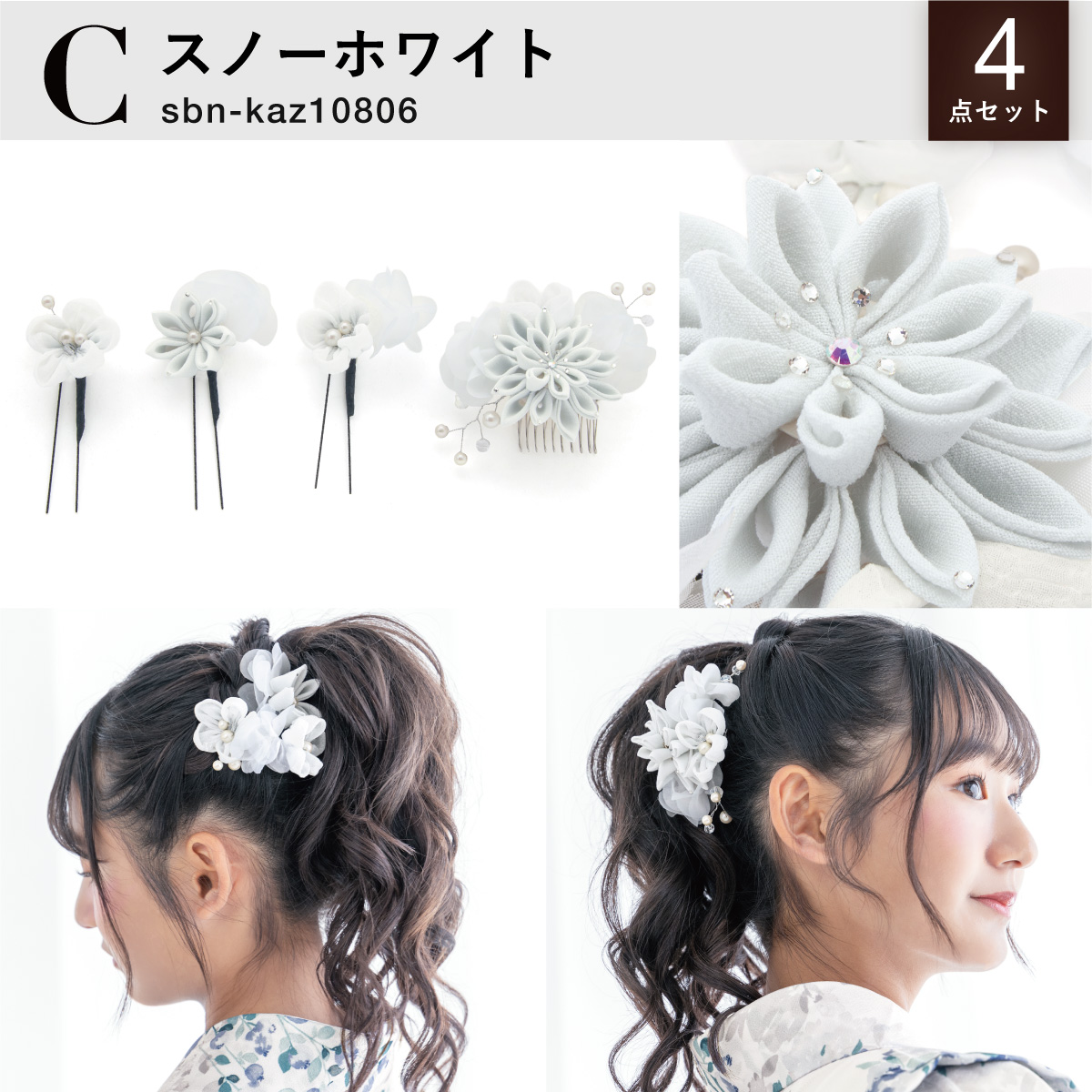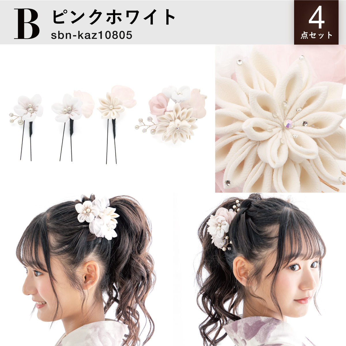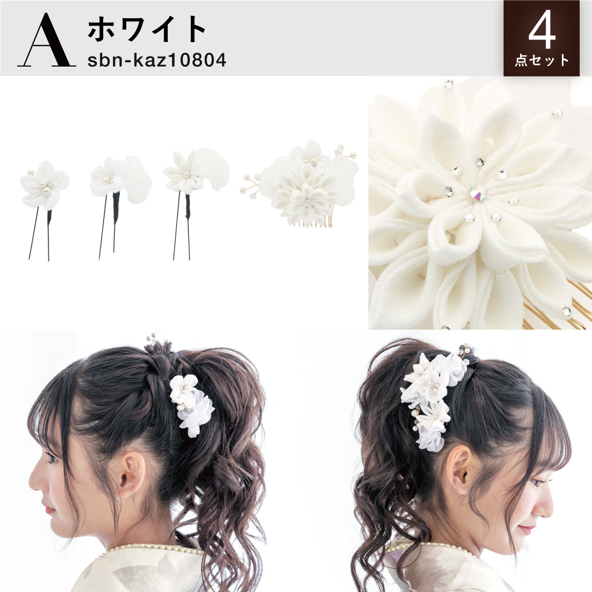 髪飾り 4点セット 成人式 卒業式 白 ピンク 灰 つまみ細工 花 オーガンジー フェイクパール ヘアアクセサリー ヘアアクセ 髪留め 振袖 袴