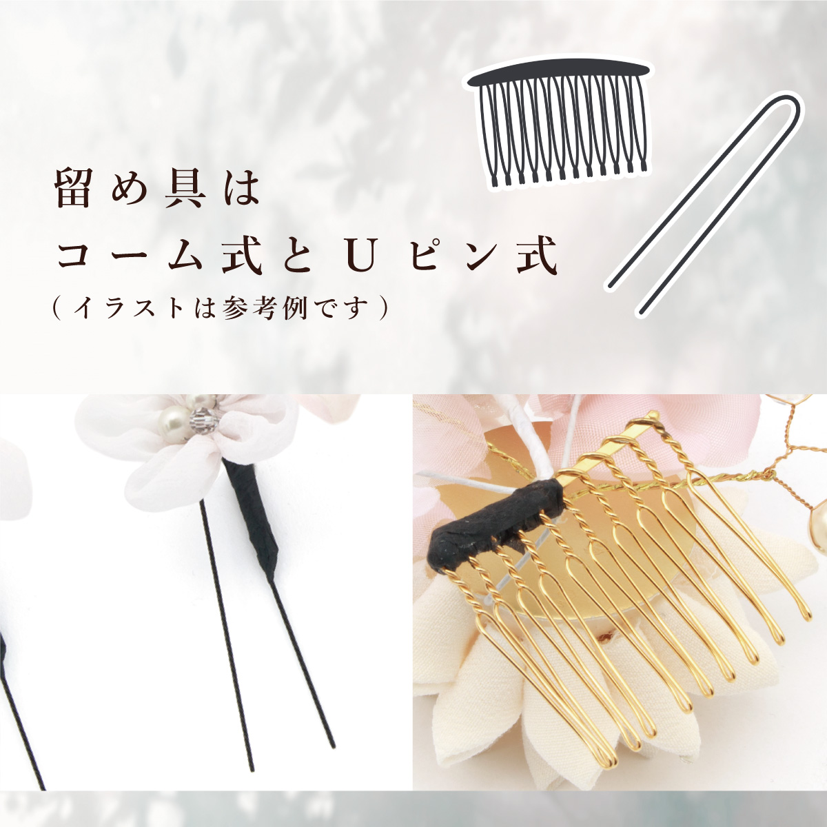 髪飾りはUピン式とコーム式ですので、着物に合わせ自由な組み合わせでご使用いただけます。根元はワイヤー式です。髪型のおしゃれに合わせ、お好みの角度に微調節できます。どれか一つだけ付けたり、重ね付けしたり、さまざまな付け方が楽しめます。モダンなデザインなので、洋服に合わせていただいても素敵です。