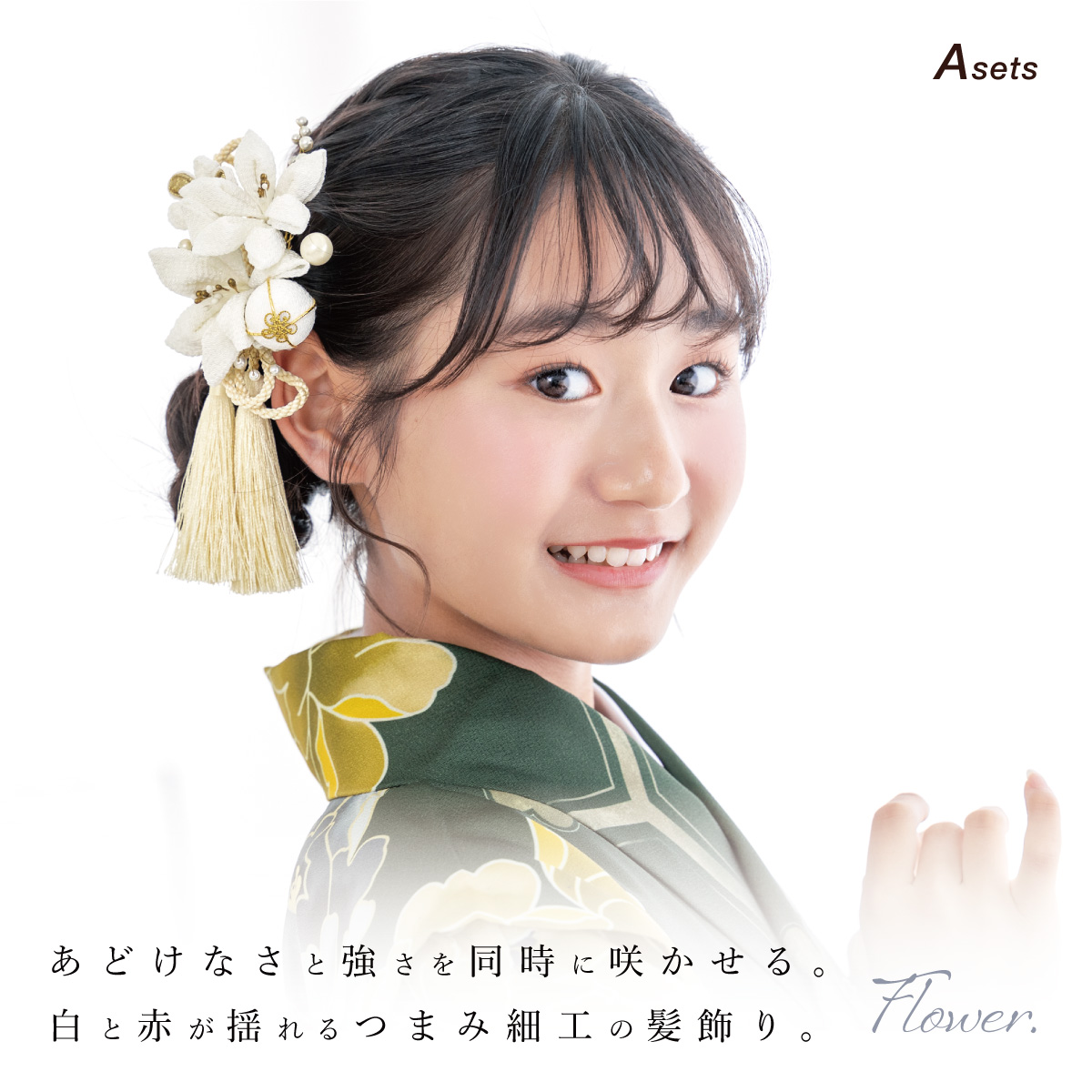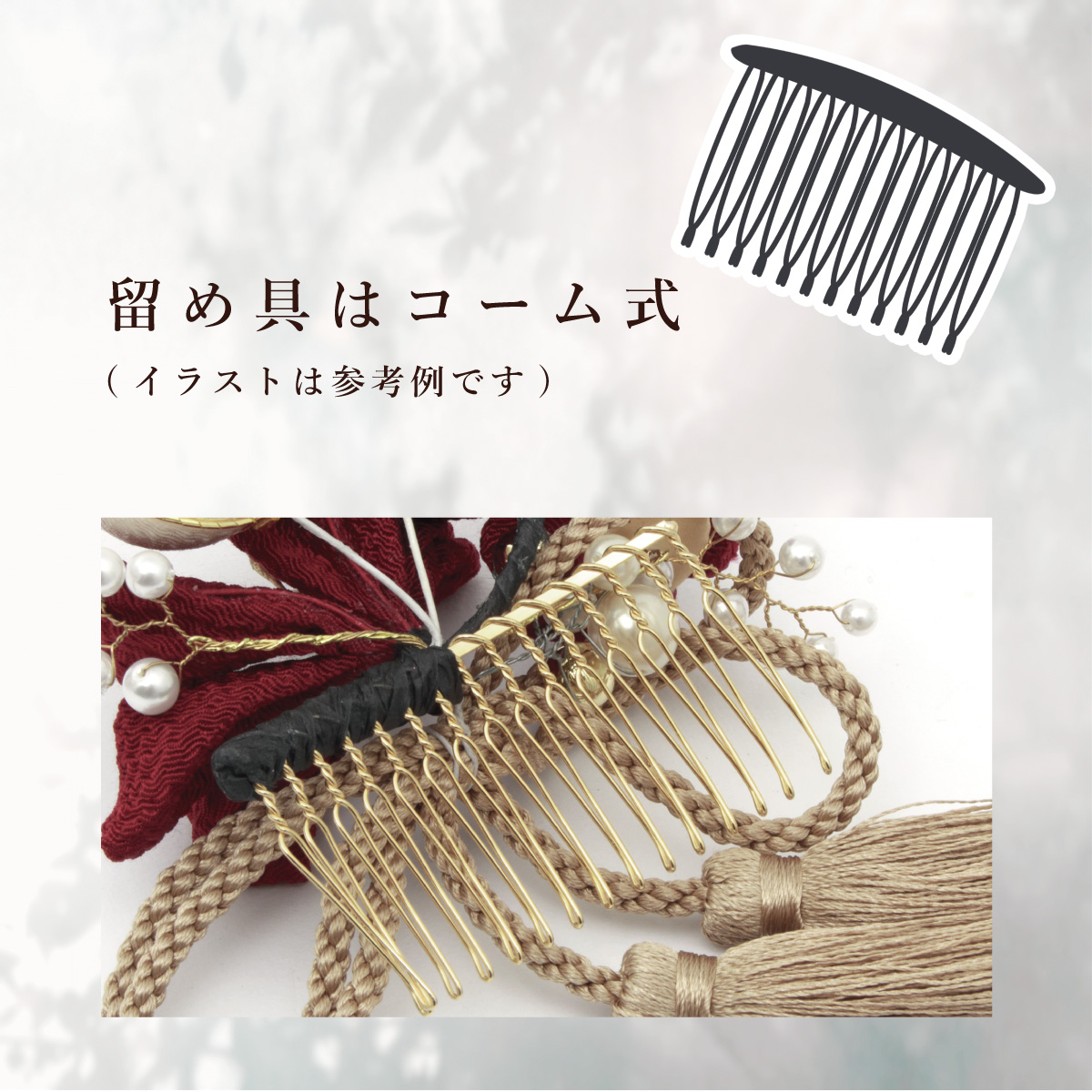 着物のヘアスタイルを彩るつまみ細工の髪飾りです。縮緬(ちりめん)素材の花びらに同じ素材も玉飾り、フェイクパールの枝や房のある組紐があしらわれた華やかなデザインです。卒業式の袴や成人式の振袖などにオススメします。
