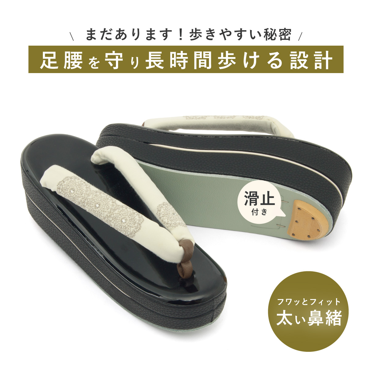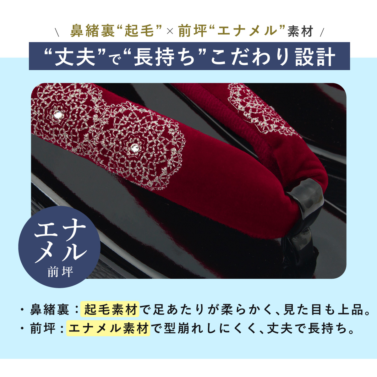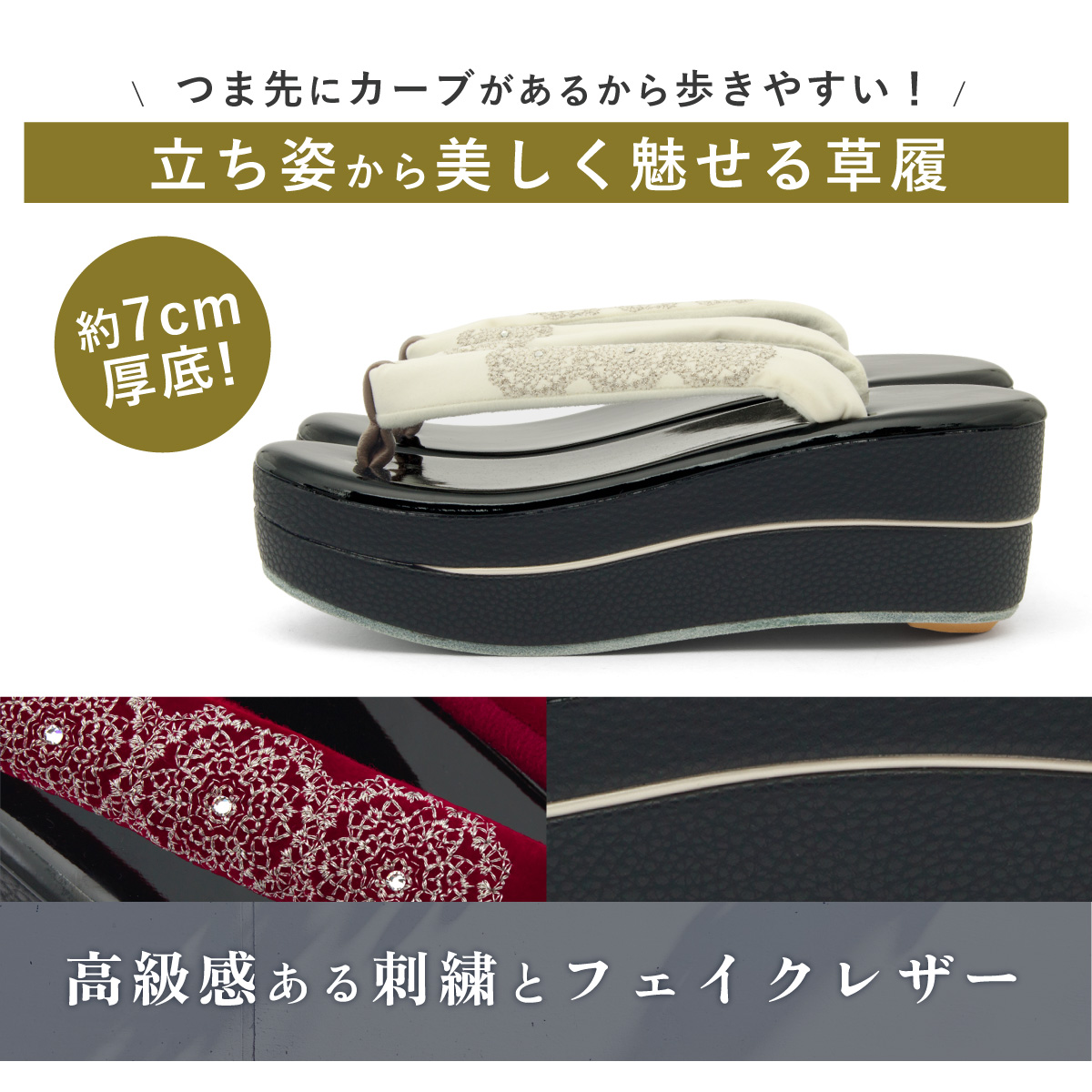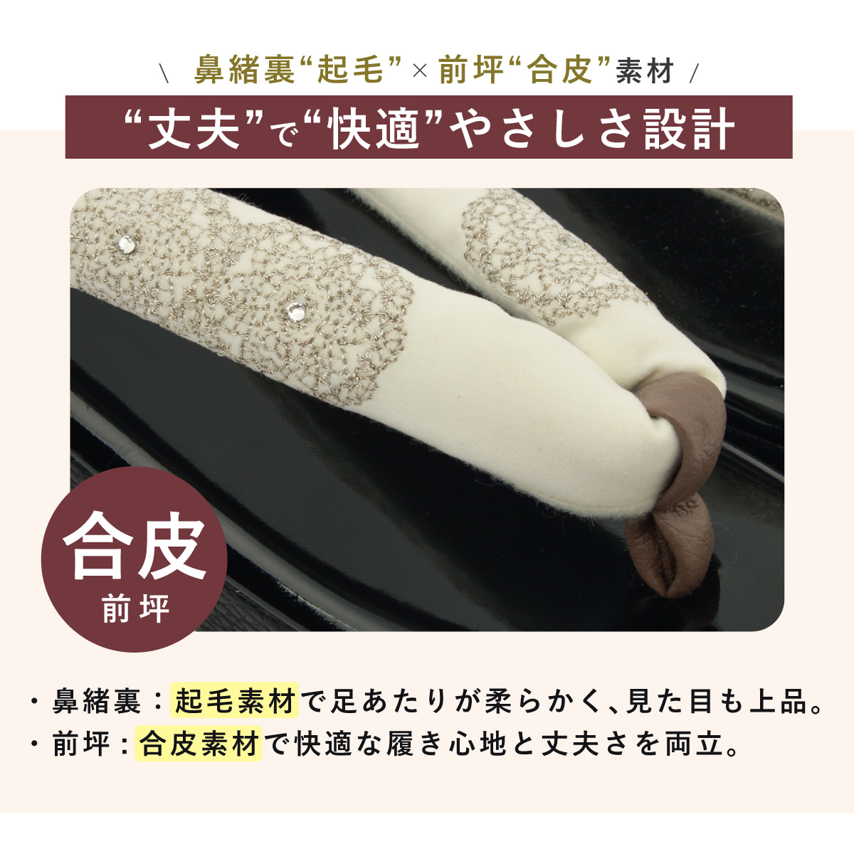 台は合皮を使用していますので、お手入れも簡単です。厚底が特徴の台には、適度なクッション性があり、歩行中における足腰への負担を軽減します。鼻緒裏には起毛素材が施されており、靴擦れなどのトラブルを防ぎます。デザインの良さばかりでなく、履きやすさ、歩きやすさにも工夫を凝らした高級草履です。
