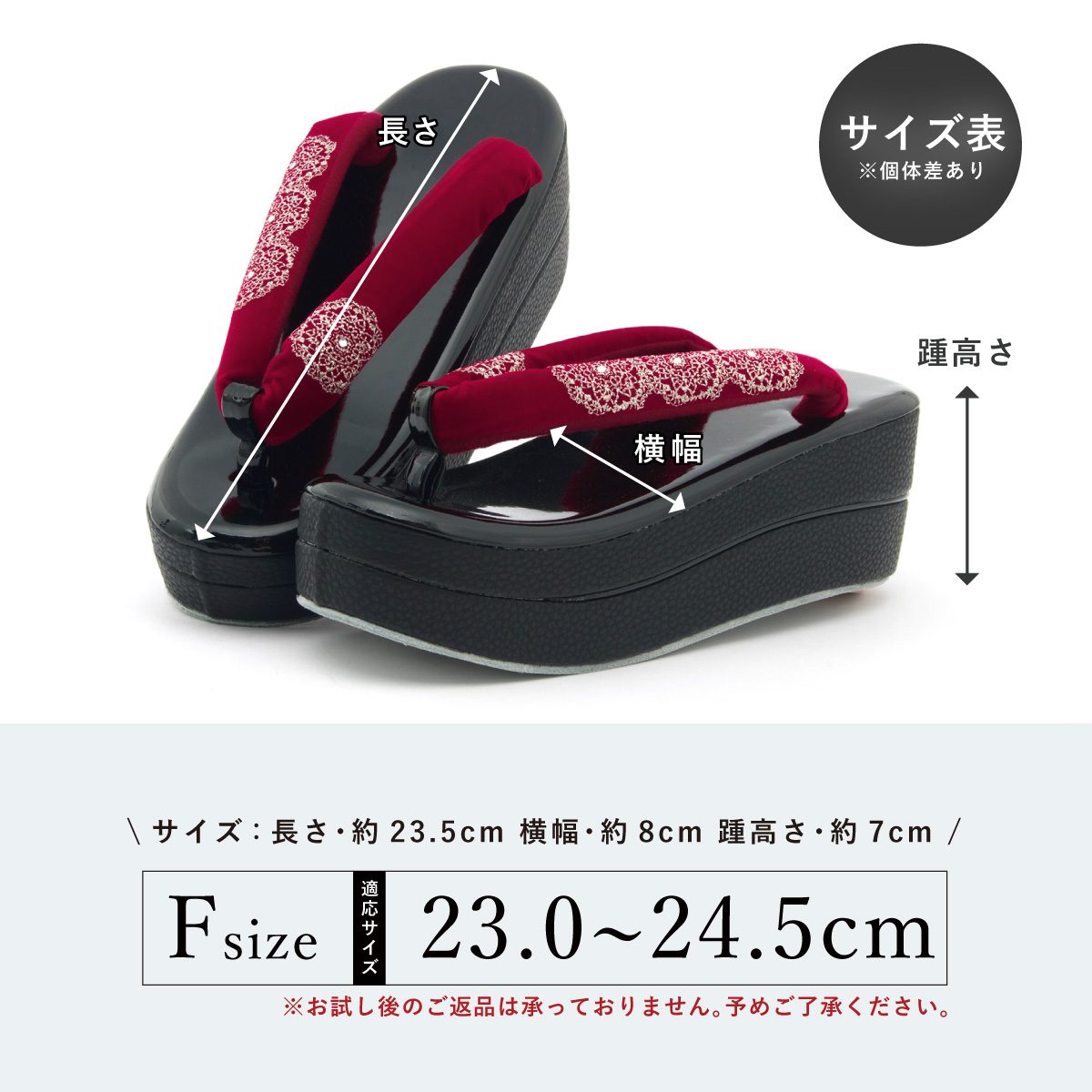 ※草履や下駄などの履物は、試し履きをされますと鼻緒の形状が変化するため、お試し後のご返品は承っておりません。ご注意ください。