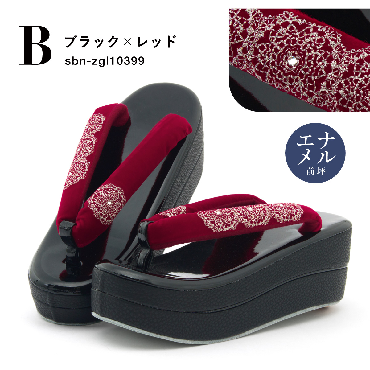 上品な美しさが漂う振袖にオススメな女性用の厚底草履です。エナメル加工の天に、別珍素材にラインストーンやレース刺繍が施された鼻緒が挿げられています。珍しい足型の台に、しっかりとした太い鼻緒も足を優しく包みます。台は、程よい高さでクッション性にも富んだ二枚芯です。成人式の振袖着物や卒業式の袴によくお似合いです。お出かけ用の華やかな着物、モダンな柄の着物に合わせても素敵です。