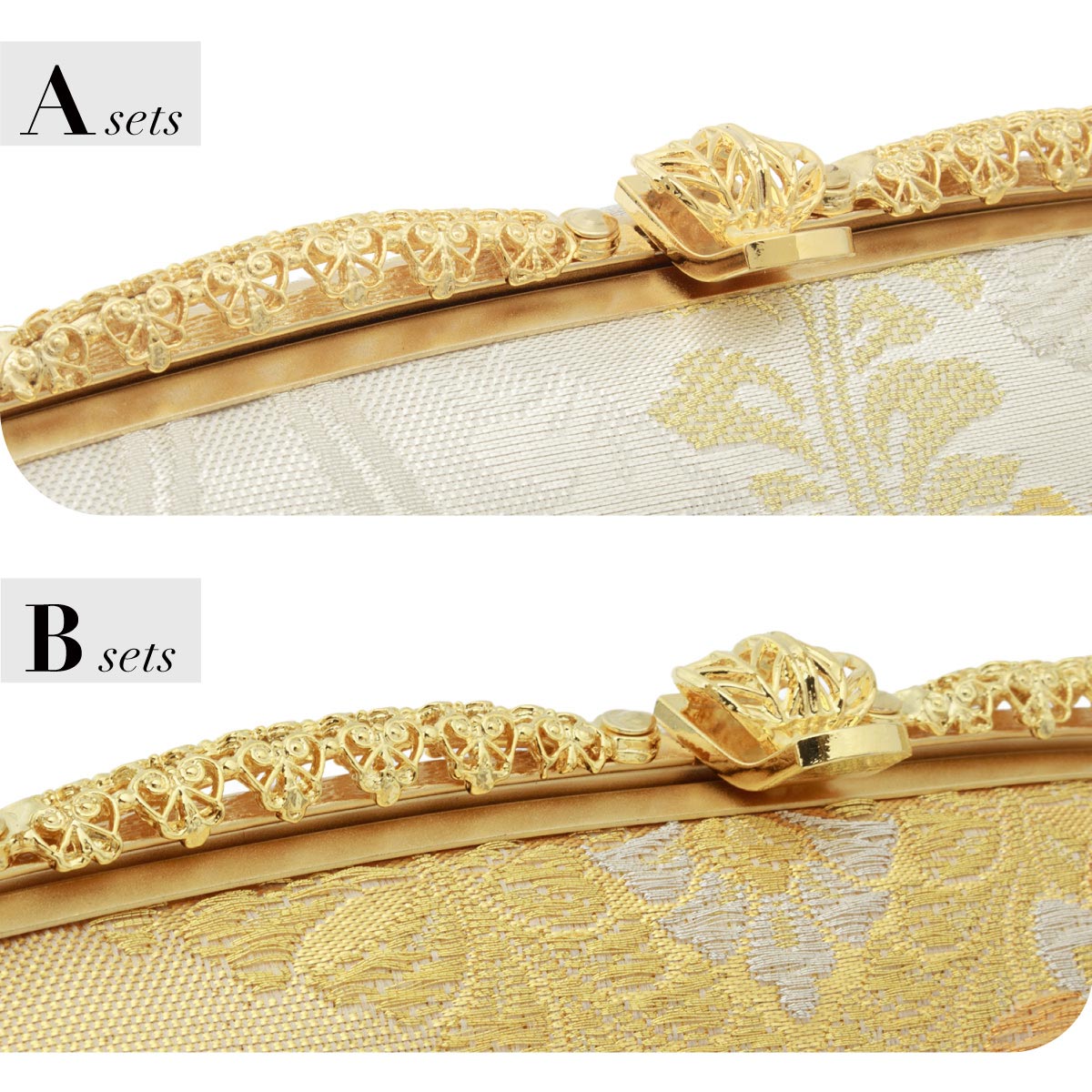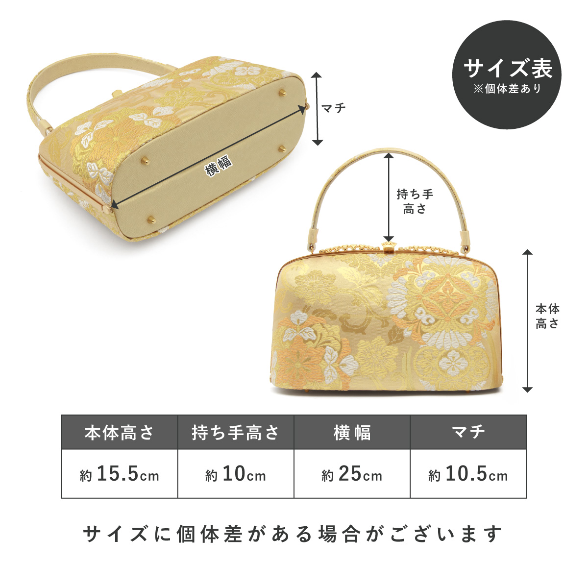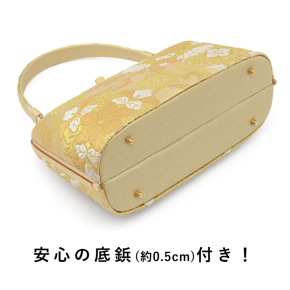バッグの開口部分は、装飾を施した金色のフレームです。口が大きく開きますので、中身が一目で分かり、物の出し入れにも便利です。パチンとしっかり閉まり、持ち運びの上でも安心感があります。お財布などが収納できる実用的な大きさです。内側には名刺サイズのコンパクトなポケットもついております。底面には4点の底鋲も施され、テーブルなどに置いた際に汚れが付くのを防ぎます。