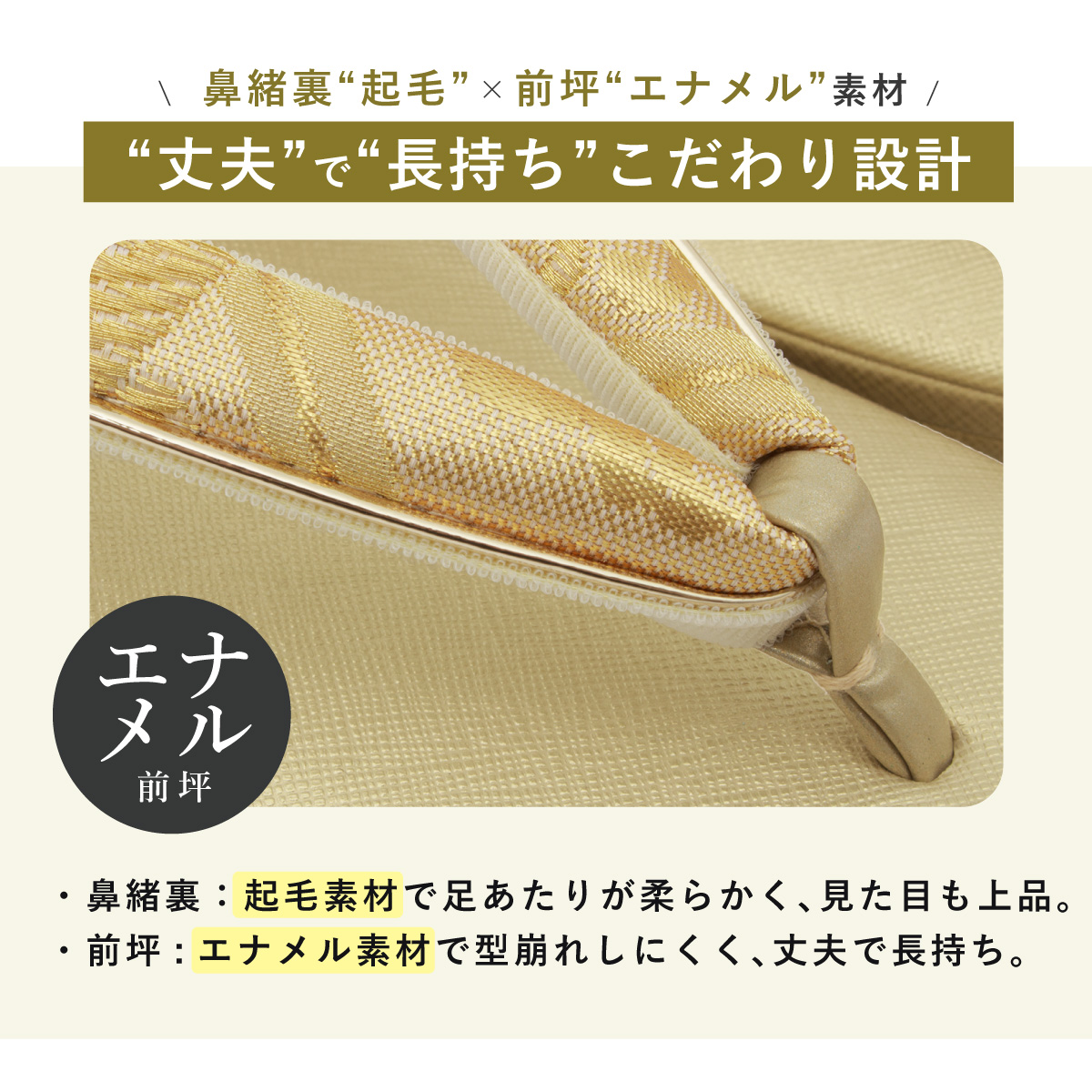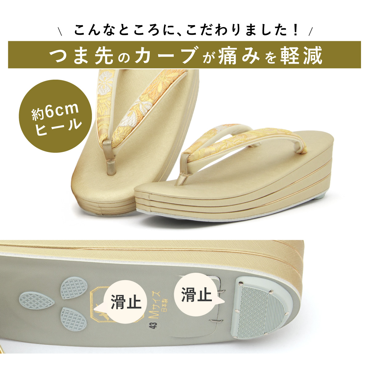草履の裏底には、滑り止めのゴム台が付いています。台には適度なクッション性があり、歩行中における足腰への負担を軽減します。鼻緒にはソフトな素材の「優花緒」を使用しています。足の出し入れがしやすく、鼻緒ずれも防止する起毛素材が施されています。おしゃれを足下から引き立てるだけでなく、快適な着物姿をサポートします。
