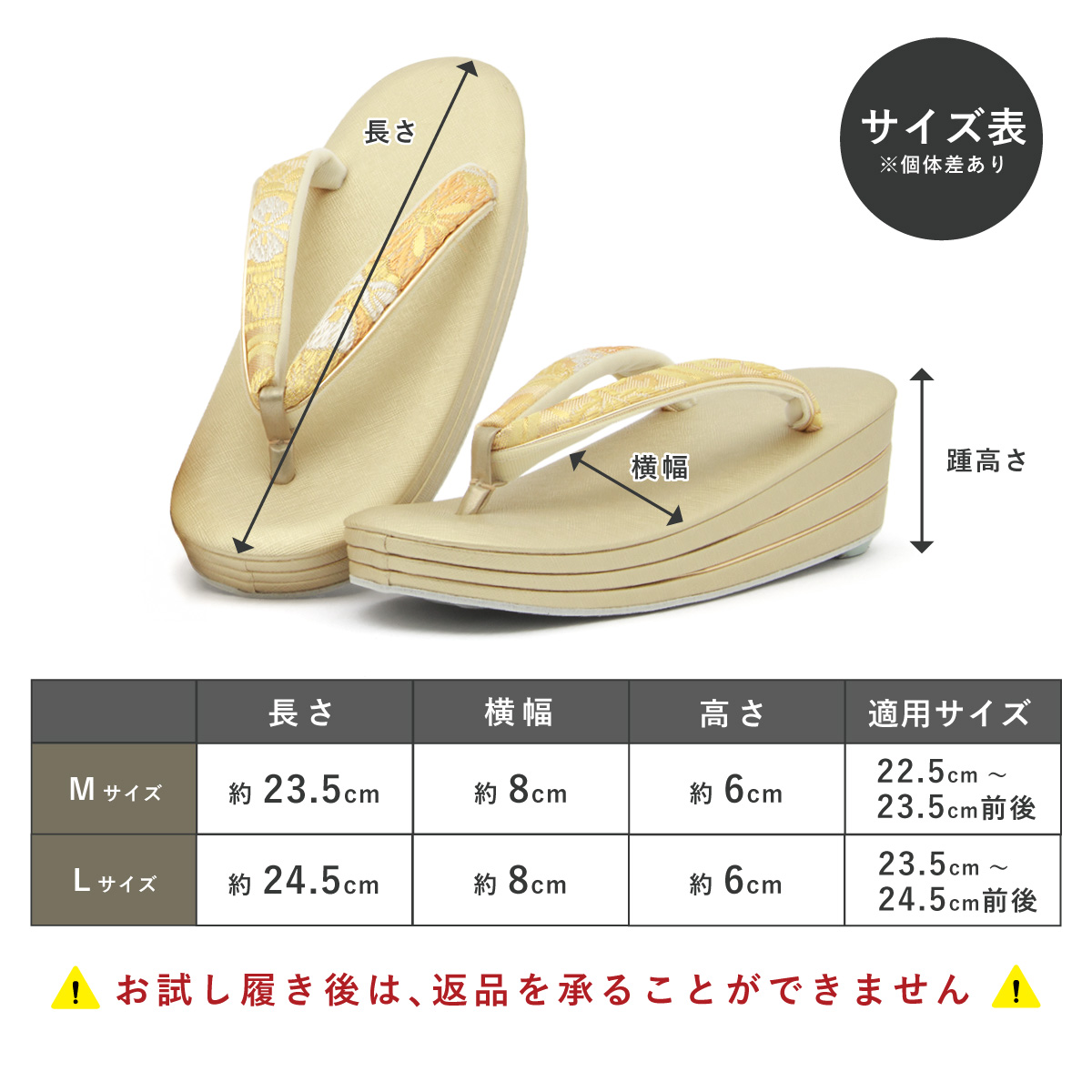 ※草履や下駄などの履物は、試し履きをされますと鼻緒の形状が変化するため、お試し後のご返品は承っておりません。ご注意ください。