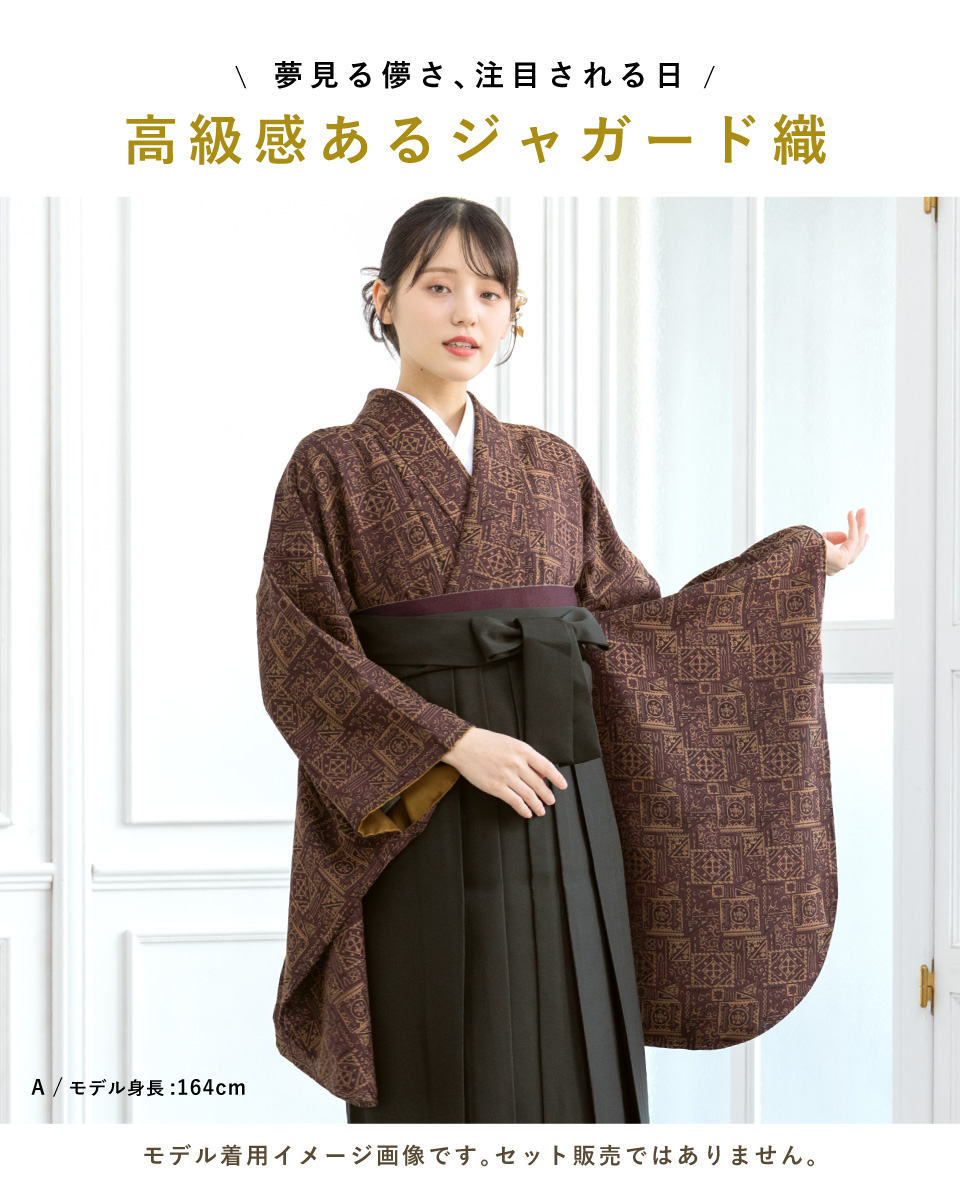 卒業式や大切な記念日を彩る二尺袖着物です。ゴブラン織調のジャガード織のアンティーク調の幾何学模様や二重織ジャガードの花のシルエットが全面に描かれたモダンなデザインです。全体に同じ模様が繰り返し描かれた、小紋タイプの着物です。生地は、ご自宅でもお手入れしやすい高級ポリエステル素材です。ふわりとした着心地で、一日中お召しでも疲れにくい着物です。仕立て上がりですので、お届け後すぐにご使用いただけます。身丈が短く動きやすい半着タイプです。袴と合わせてご使用ください。