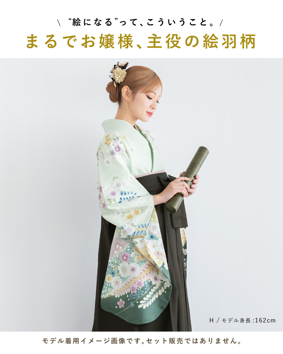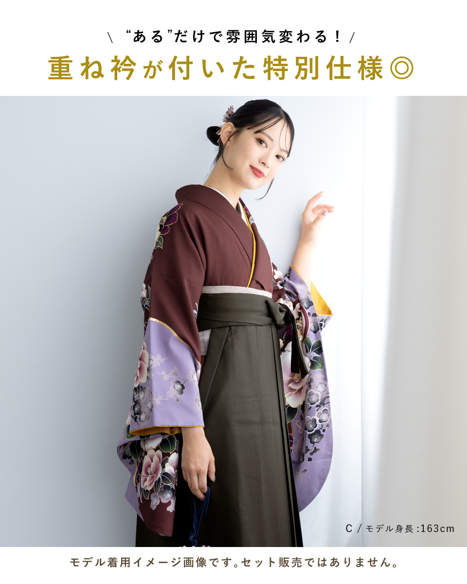 卒業式や大切な記念日を彩る、重ね衿付きの二尺袖着物です。大輪の桜の花々に鶴紋が描かれた華やかなデザインです。袖から胸にかけて、継ぎ目で柄が途切れないように縫製された絵羽模様(絵羽柄)です。生地は、ご自宅でもお手入れもしやすい高級ポリエステル素材です。ふわりとした着心地で、一日中お召しでも疲れにくい着物です。仕立て上がりですので、お届け後すぐにご使用いただけます。身丈が短く動きやすい半着タイプです。袴と合わせてご使用ください。