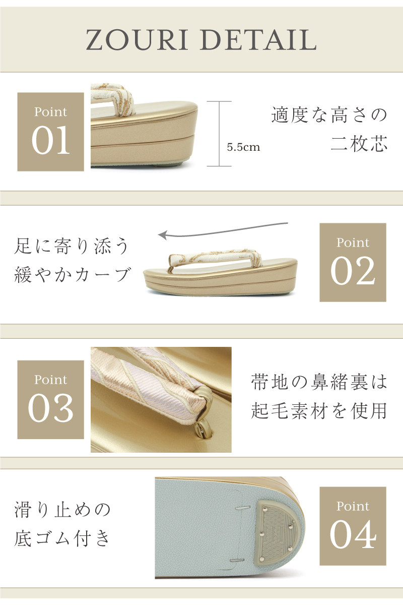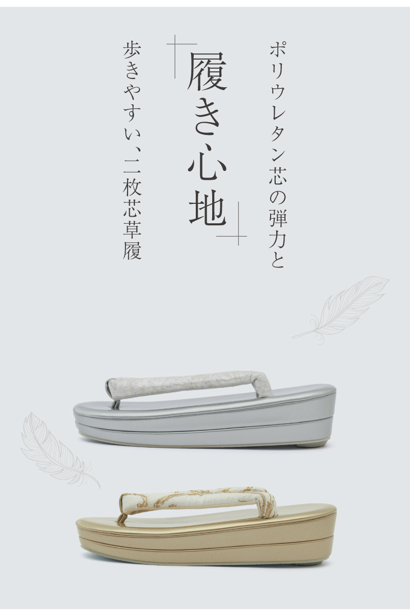 二枚芯の草履の台には適度なクッション性があり、歩行中における足腰への負担を軽減します。草履の裏底には、ゴム製の滑り止めがついているので、急な雨でも滑りにくく安心です。おしゃれを足下から引き立てるだけでなく、快適な着物姿をサポートします。