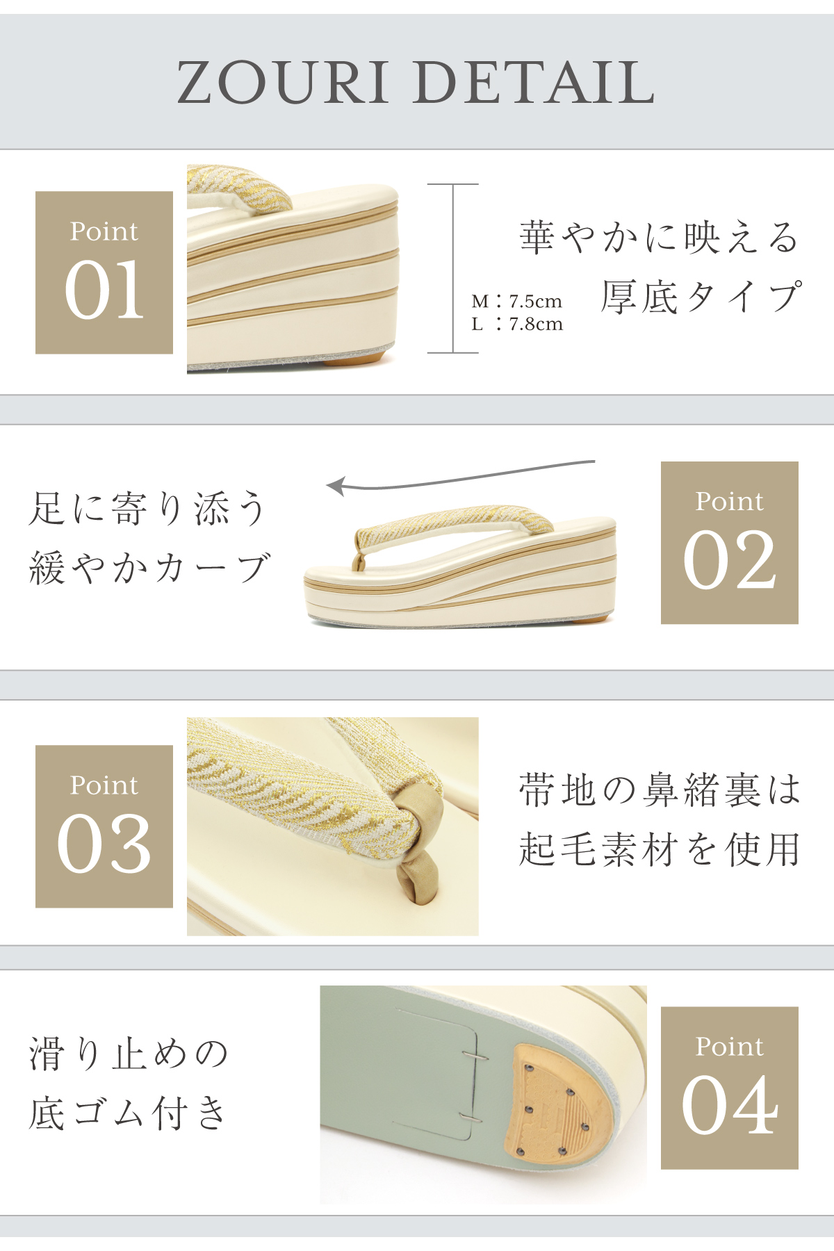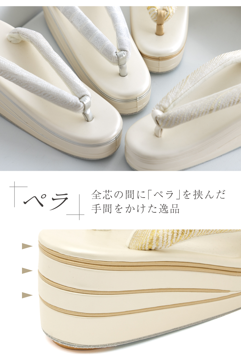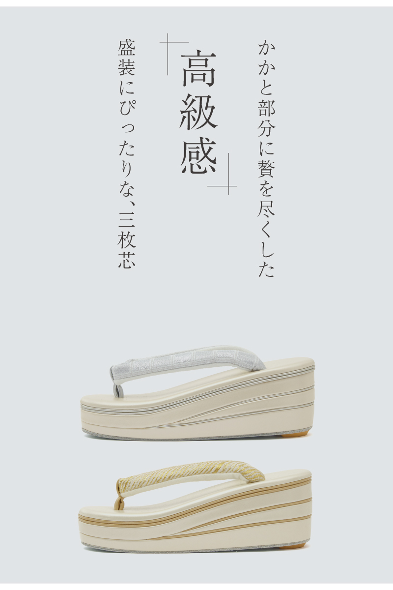 三枚芯の草履の台には適度なクッション性があり、歩行中における足腰への負担を軽減します。鼻緒裏には、足の出し入れがしやすく、鼻緒ずれも防止する起毛素材が施されています。裏底には、滑り止めのゴム台が付いています。おしゃれを足下から引き立てるだけでなく、快適な着物姿をサポートします。