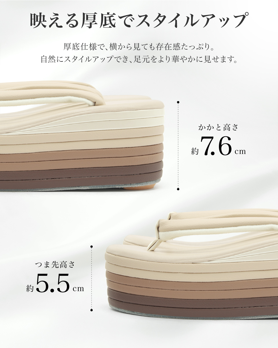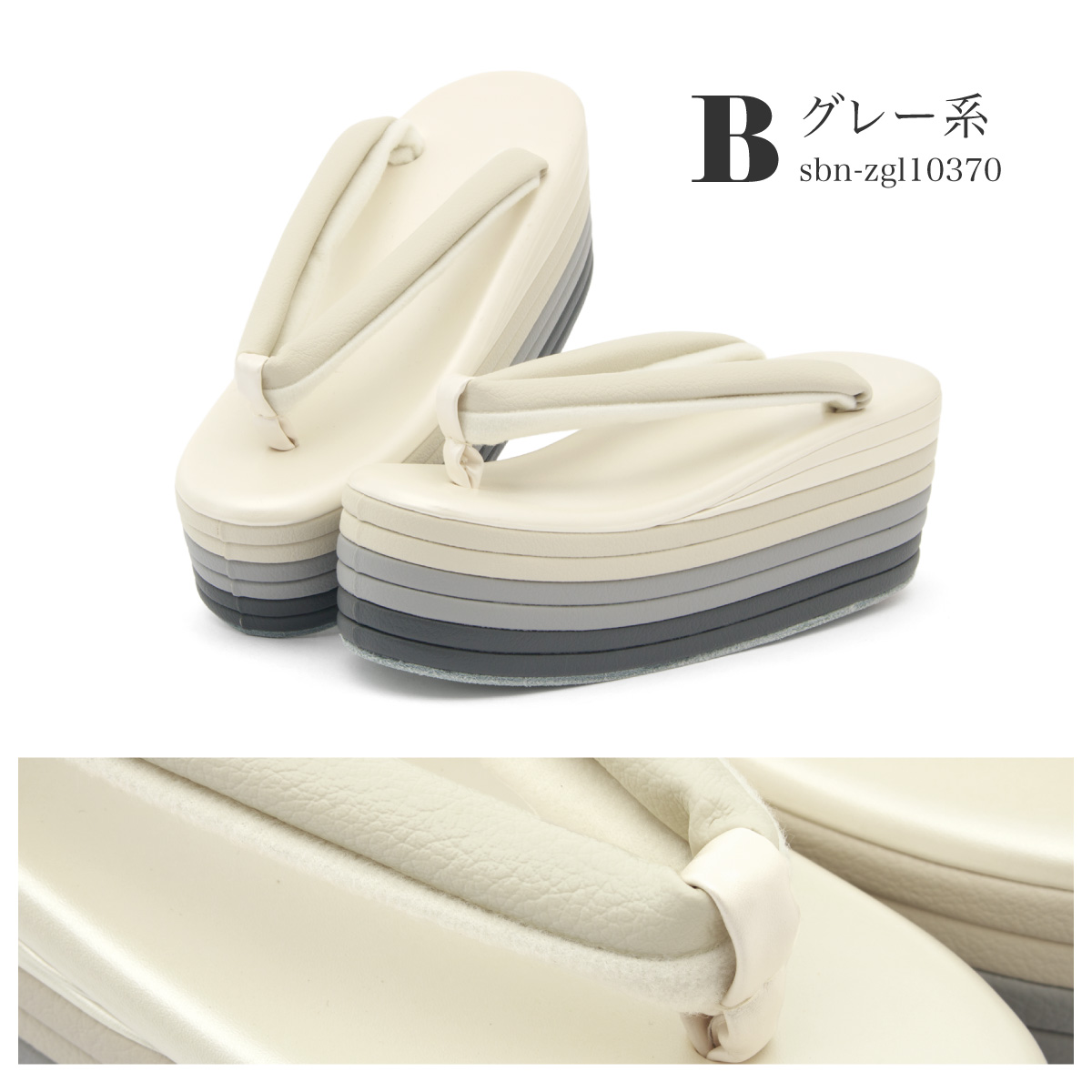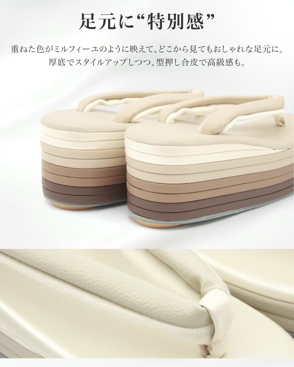 上品な美しさが漂う、振袖にオススメな女性用のミルフィーユのような厚底草履です。天は艶消しのエンボス加工で、巻と鼻緒は同じ素材を使用しています。巻きは同系色の芯をミルフィーユのように重ねたグラデーションが美しいデザインです。成人式の振袖着物や卒業式の袴によくお似合いです。お出かけ用の華やかな着物、モダンな柄の着物に合わせても素敵です。