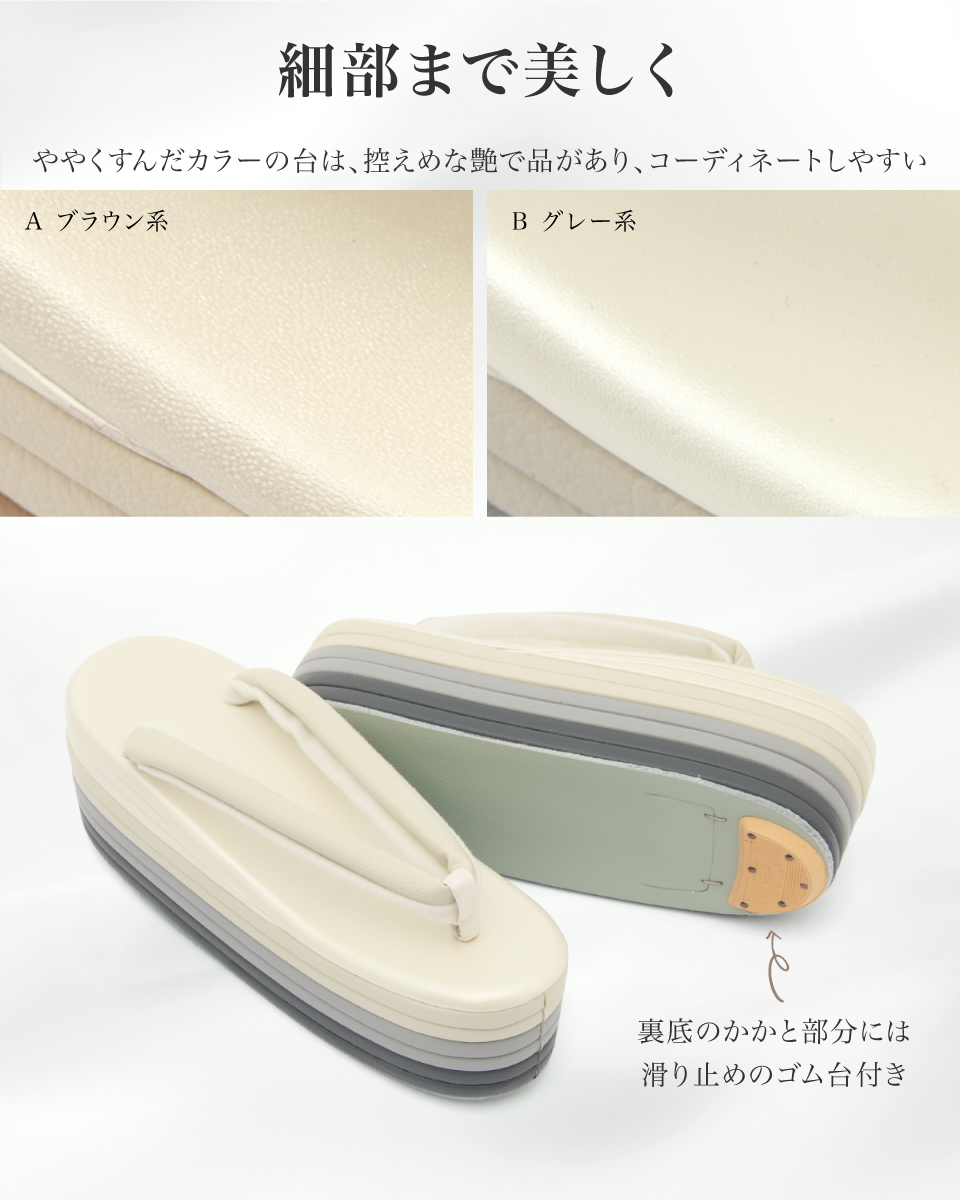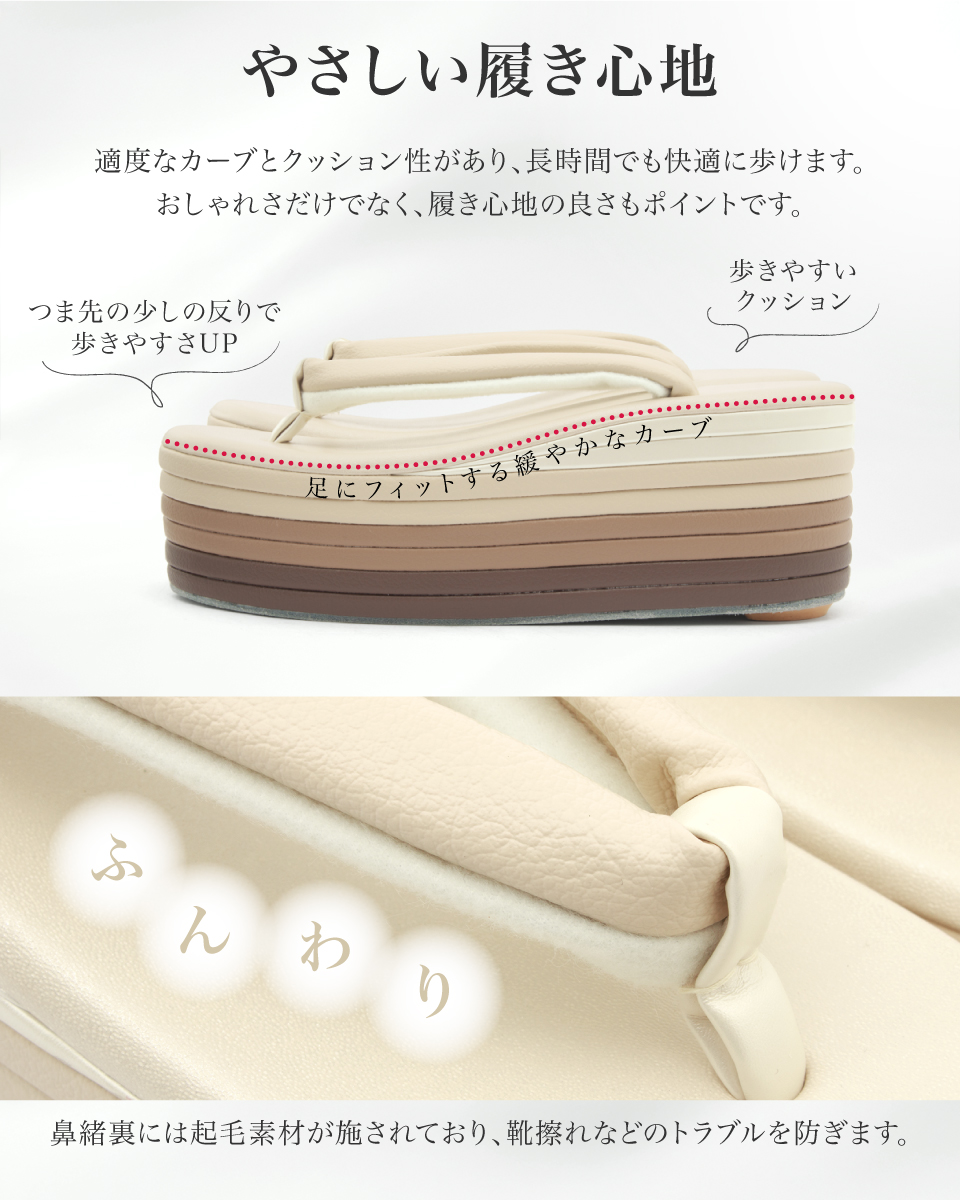 厚底が特徴の台には、適度なクッション性があり、歩行中における足腰への負担を軽減します。鼻緒裏には起毛素材が施されており、靴擦れなどのトラブルを防ぎます。デザインの良さばかりでなく、履きやすさ、歩きやすさにも工夫を凝らした高級草履です。裏底には、滑り止めのゴム台が付いています。