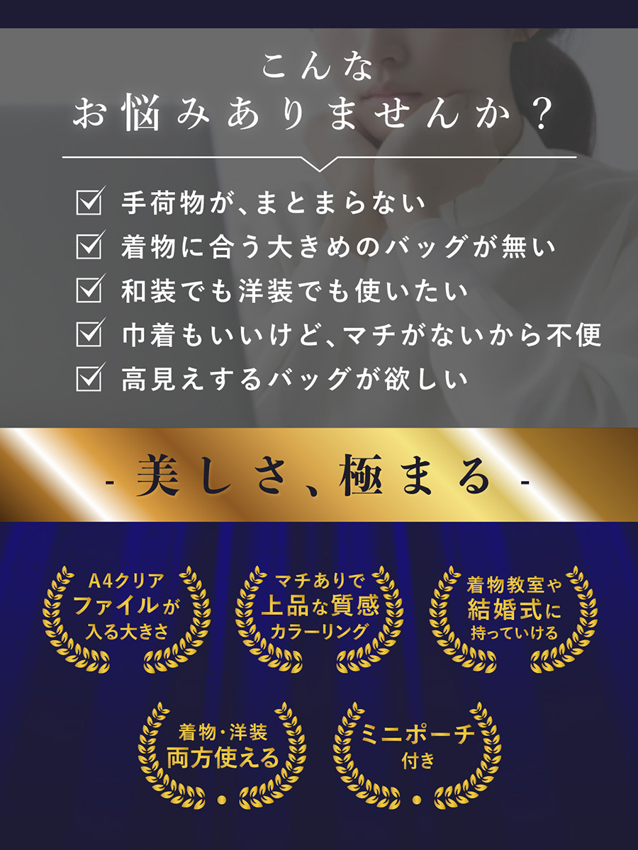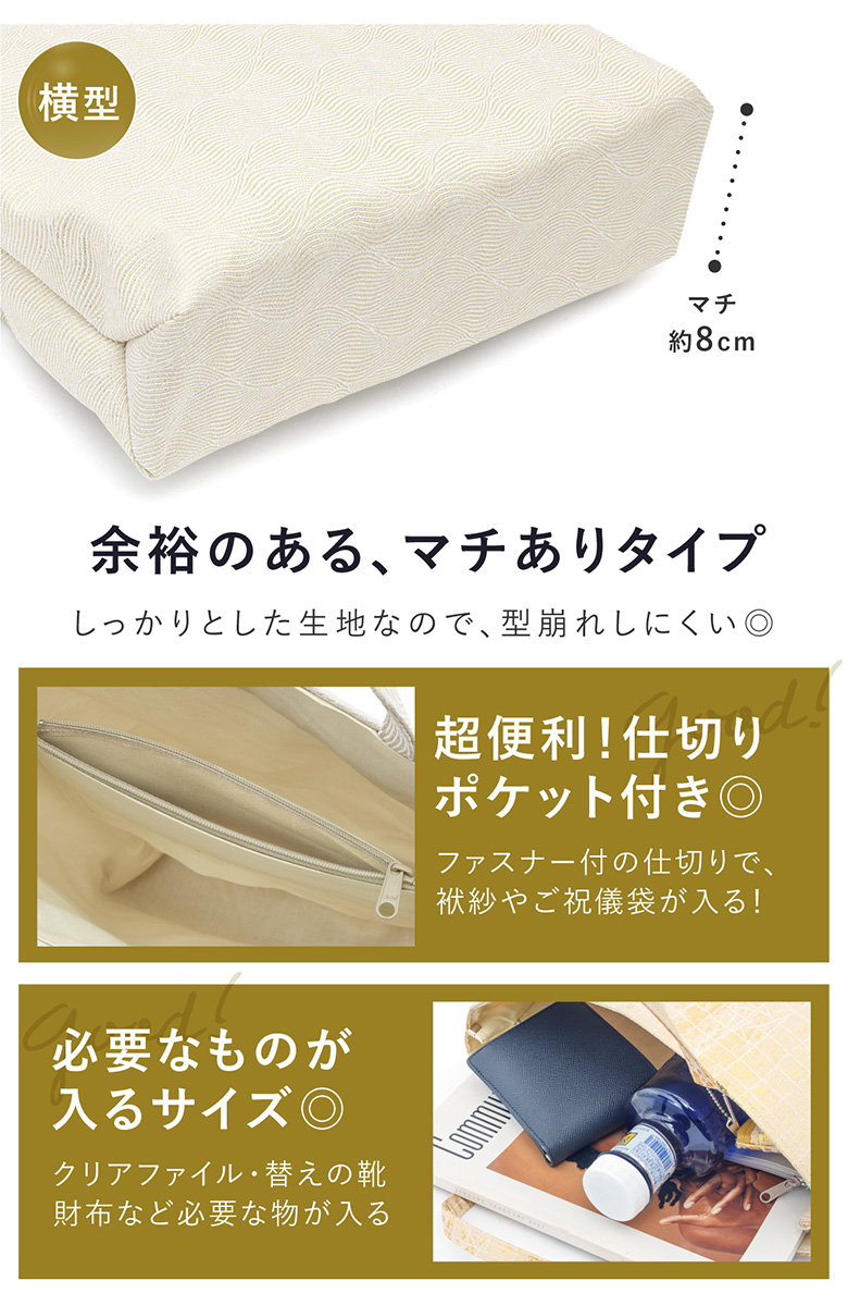 特別な日の和装におすすめなフォーマル向けのサブバッグです。金襴織地に波紋や朧格子が描かれた麗しいモダンなデザインです。金襴織地を使用しており、他にはない贅沢で優雅な美しさが引き立ちます。こちらは結婚式やパーティなどのフォーマルな場面で、メインのバッグに入りきらない荷物を入れるのに便利なアイテムです。訪問着や色無地・留袖などに合わせて、また小紋や洋装のお出かけにも、和洋問わずご利用いただけます。謝恩会、結婚式やパーティなどの晴れの日の装いにお似合いです。