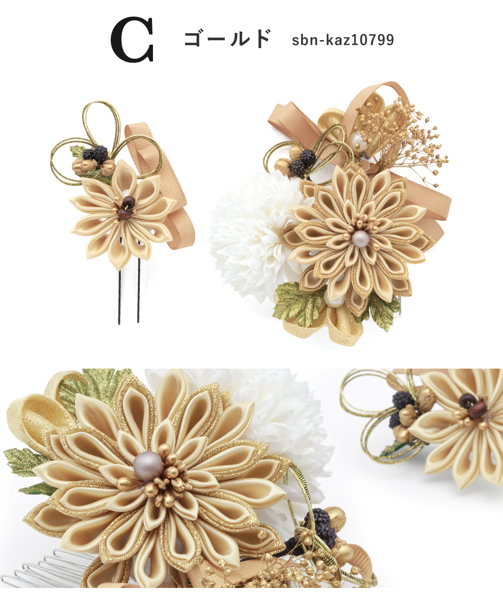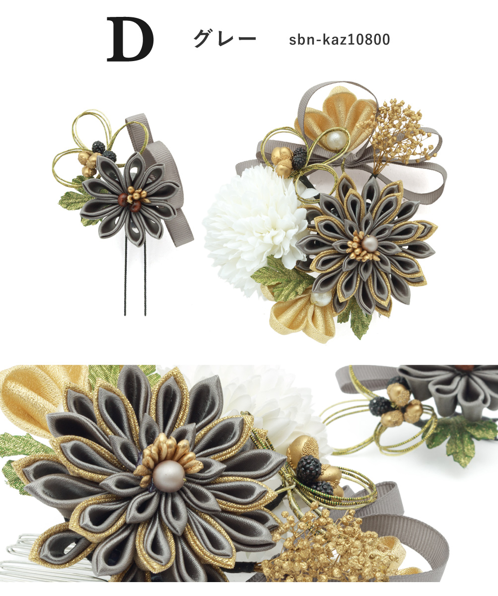 お花や葉の一つ一つの根元はワイヤー式になっていますので、 ヘアスタイルに合わせて角度を調整する事が可能です。大きな髪飾りの留め具はコーム(櫛)式、小さな髪飾りはUピン式ですので、着物に合わせ自由な組み合わせでご使用いただけます。ヘアスタイルによっても使い分け出来ますので、たいへん重宝するアイテムです。