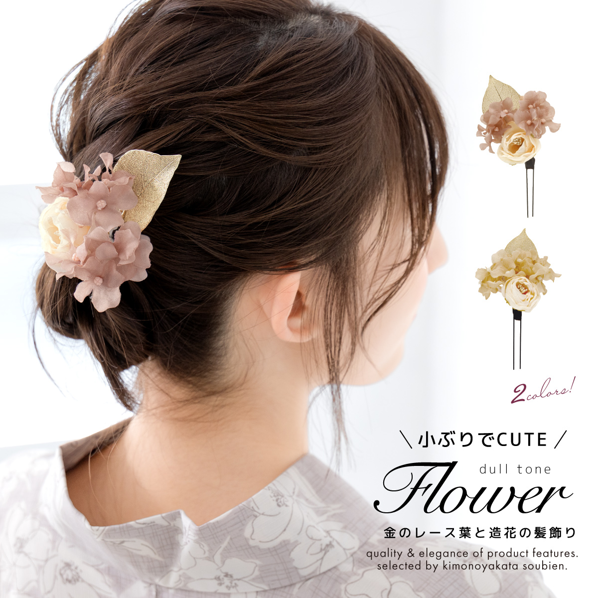 さりげないヘアアレンジが、着物のオシャレに差をつけます。お顔の印象をパッと明るくし、綺麗な写真が撮れると評判です。スタジオでの写真撮影から携帯電話でのスナップまで、思い出となる一枚が残せます。こちらの髪飾りを、特別な日の着物姿にぜひお役立てください。